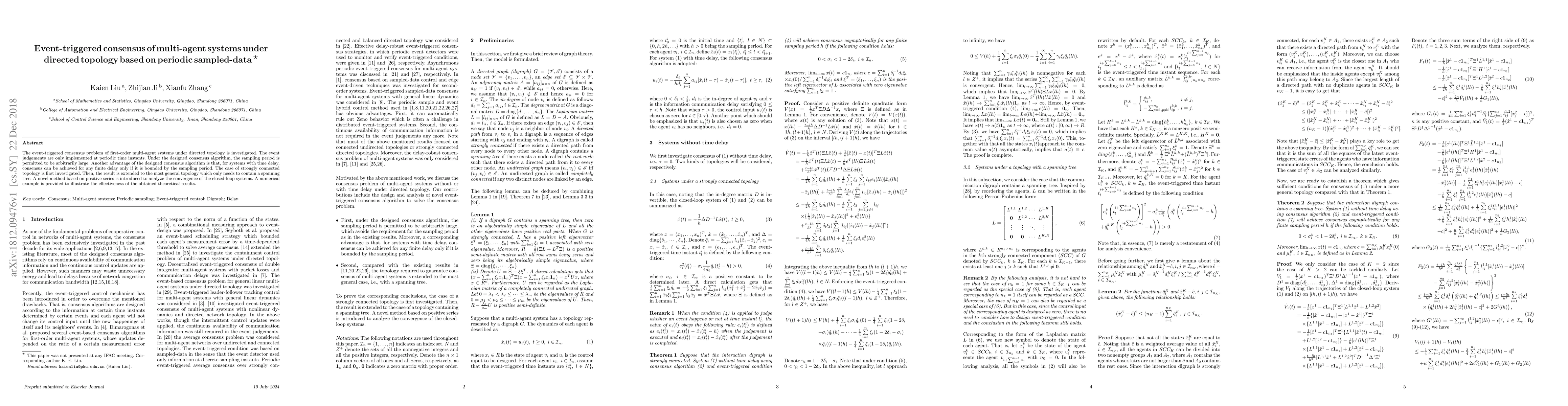 This paper investigates event-triggered consensus for first-order multi-agent systems under directed topology using periodic sampled-data. The proposed algorithm allows for large sampling periods and achieves consensus even with bounded time delays, extending results from strongly connected to general directed topologies.