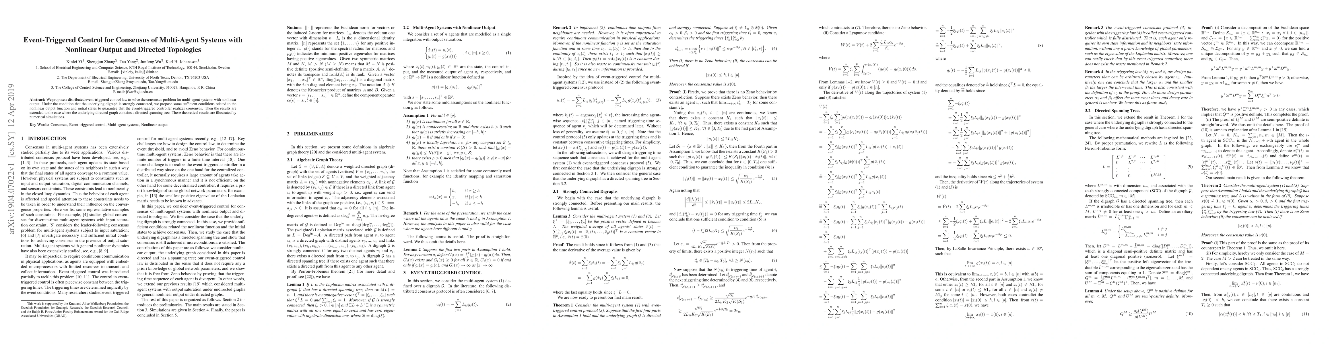 The research proposes a distributed event-triggered control law for multi-agent systems with nonlinear outputs and directed topologies, ensuring consensus under specific conditions.