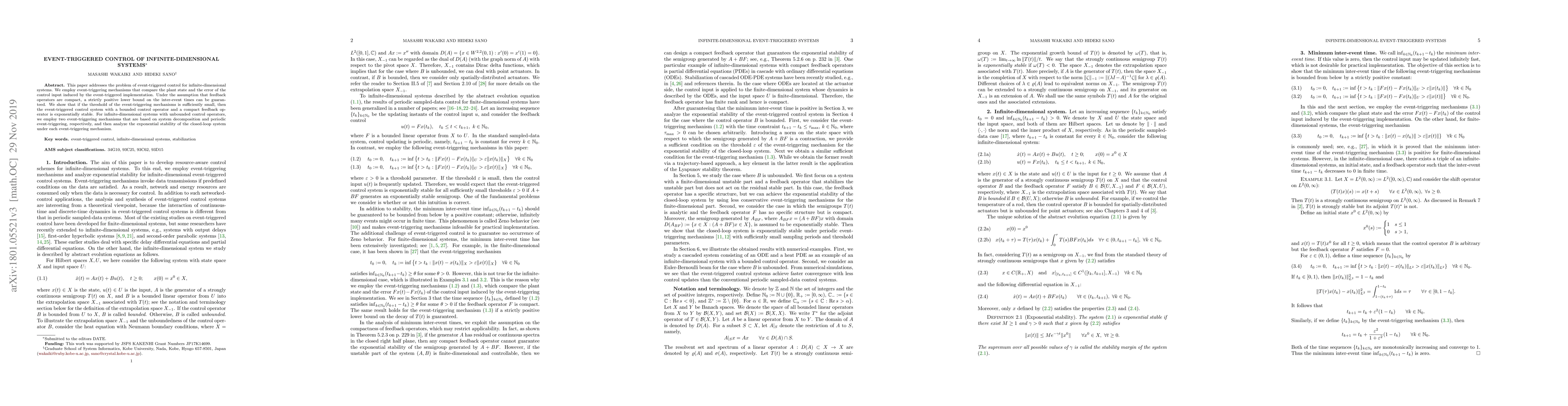 This paper investigates event-triggered control strategies for infinite-dimensional systems, ensuring exponential stability under compact feedback operators and exploring alternative mechanisms for systems with unbounded control operators. The study guarantees a strictly positive lower bound on inter-event times and analyzes stability through system decomposition and periodic triggering.