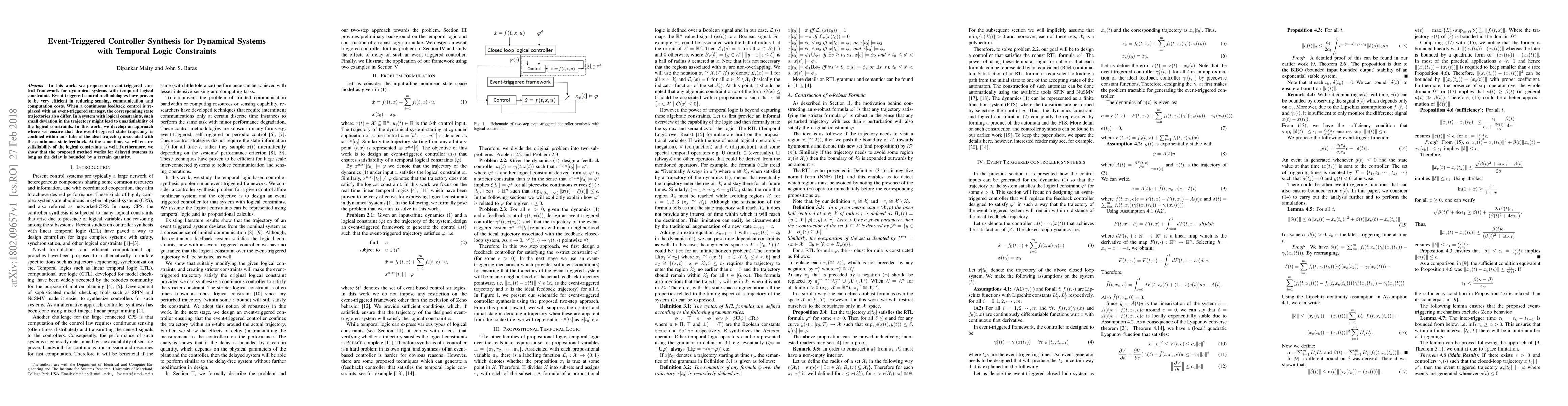 This paper proposes an event-triggered control framework for dynamical systems with temporal logic constraints, ensuring state trajectories remain within a tube of the ideal trajectory while satisfying the constraints, and demonstrating applicability to delayed systems with bounded delays.