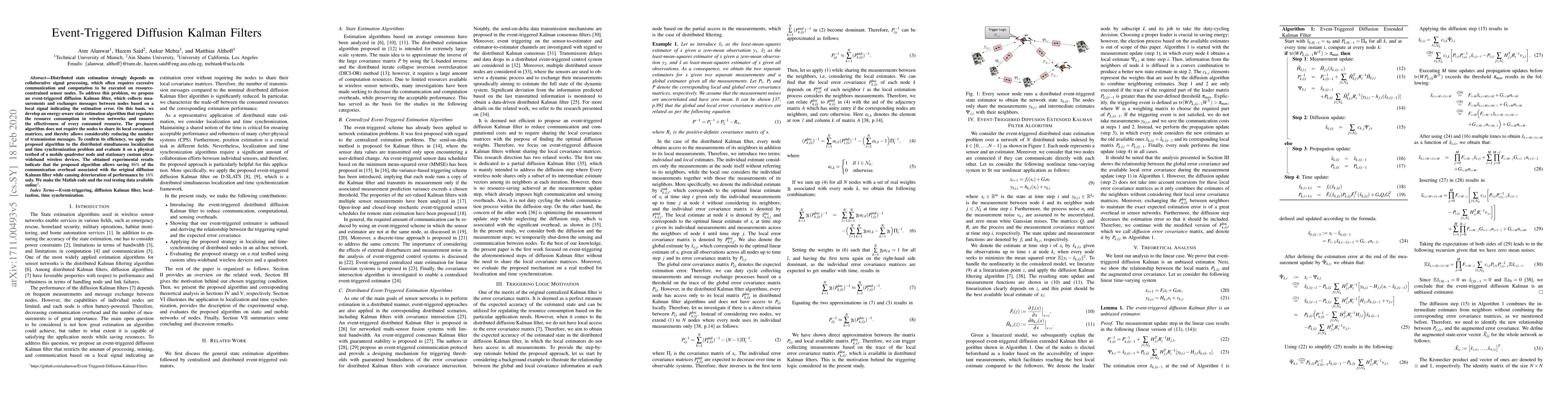 The paper proposes an event-triggered diffusion Kalman filter to reduce communication and computation in distributed state estimation, achieving significant energy savings with minimal performance loss. Experimental results on a mobile quadrotor and ultra-wideband devices show an 86% reduction in communication overhead with only a 16% performance drop.