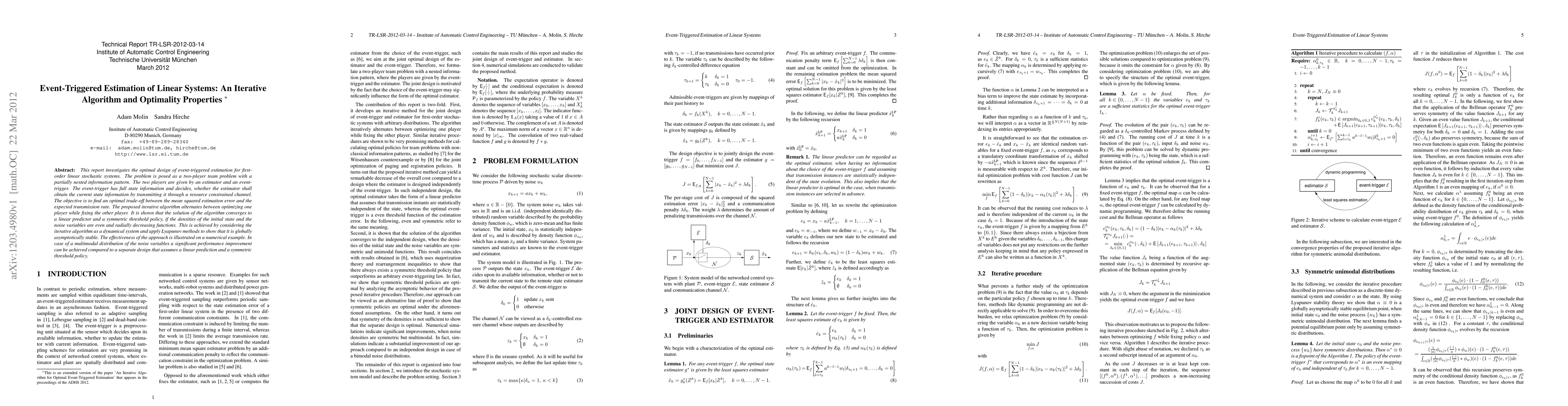 This report investigates the optimal design of event-triggered estimation for first-order linear stochastic systems. The problem is posed as a two-player team problem with a partially nested information pattern. The two players are given by an estimator and an event-trigger. The event-trigger has full state information and decides, whether the estimator shall obtain the current state information by transmitting it through a resource constrained channel. The objective is to find an optimal trade-off between the mean squared estimation error and the expected transmission rate. The proposed iterative algorithm alternates between optimizing one player while fixing the other player. It is shown that the solution of the algorithm converges to a linear predictor and a symmetric threshold policy, if the densities of the initial state and the noise variables are even and radially decreasing functions. The effectiveness of the approach is illustrated on a numerical example. In case of a multimodal distribution of the noise variables a significant performance improvement can be achieved compared to a separate design that assumes a linear prediction and a symmetric threshold policy.