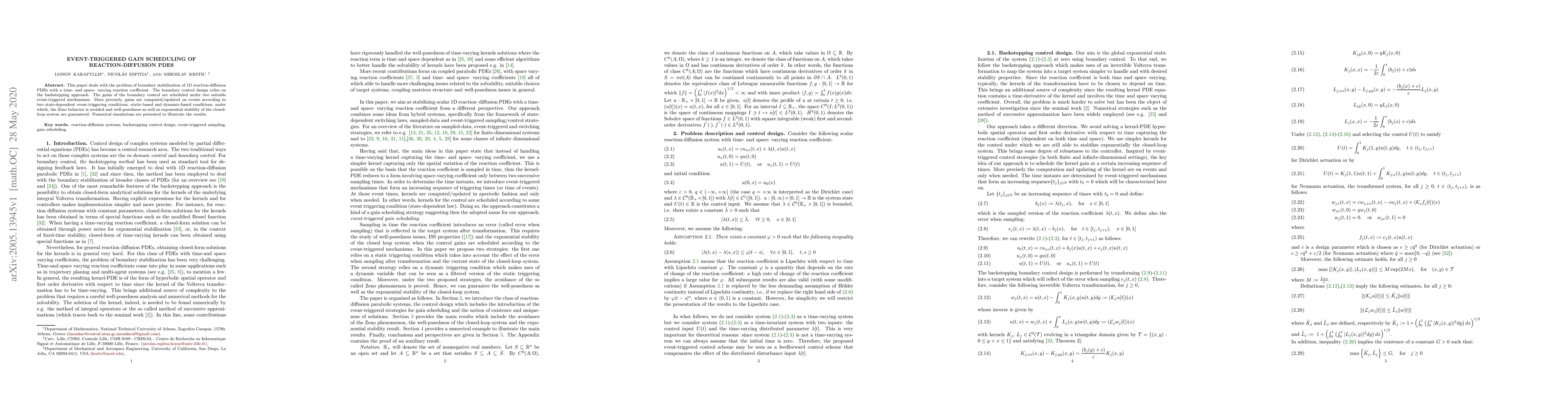 This paper addresses boundary stabilization of 1D reaction-diffusion PDEs using backstepping and event-triggered gain scheduling to avoid Zeno behavior, ensuring well-posedness and exponential stability, validated through numerical simulations.