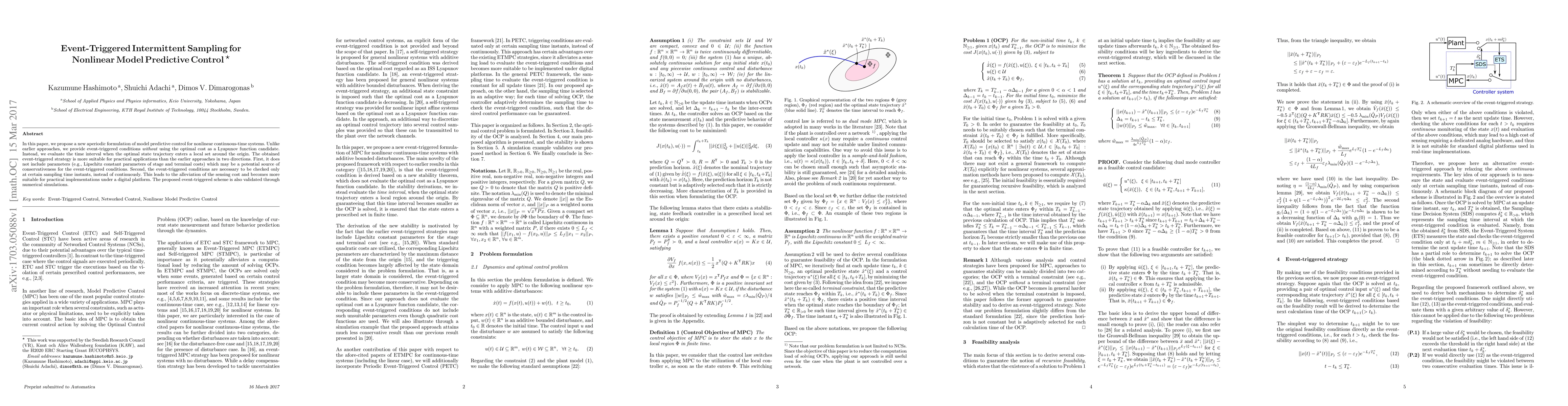 This paper introduces a novel event-triggered intermittent sampling method for nonlinear model predictive control, avoiding reliance on optimal cost as a Lyapunov function. The proposed strategy reduces conservativeness and sampling frequency, thus lowering sensing costs and enhancing practical applicability.