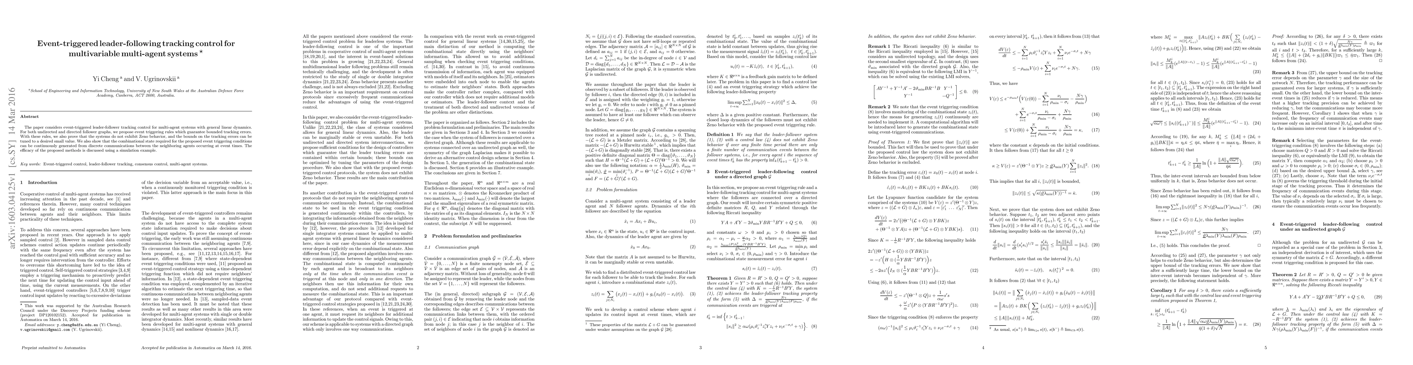 This paper proposes event-triggered leader-following control for multi-agent systems, ensuring bounded tracking errors and preventing Zeno behavior. The event triggering rules can be continuously generated from discrete communications, and the tracking error bounds can be tuned.