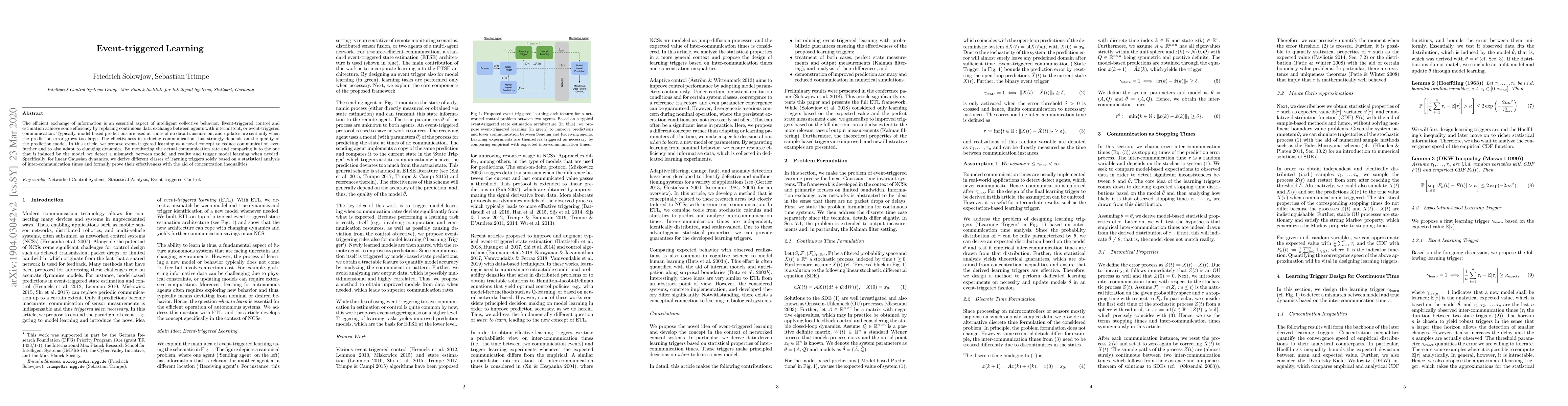 This paper proposes event-triggered learning to further reduce communication in intelligent systems by adapting the model based on the actual communication rate, triggering updates when a mismatch is detected. It derives learning triggers for linear Gaussian dynamics and proves their effectiveness using statistical analysis and concentration inequalities.