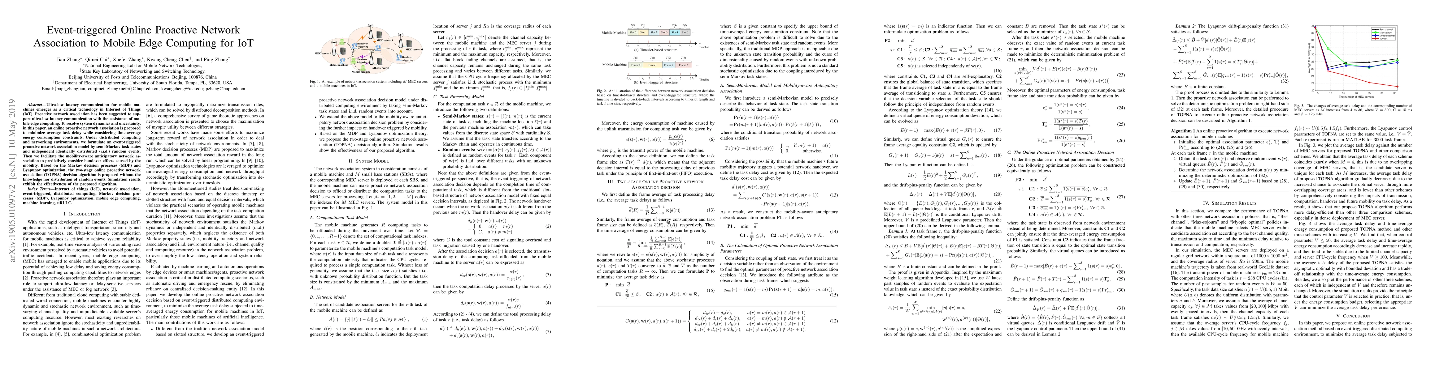 This paper proposes an event-triggered online proactive network association model for mobile edge computing in IoT to minimize average task delay and manage energy consumption. The TOPNA algorithm leverages Markov decision processes and Lyapunov optimization to achieve mobility-aware anticipatory network association without requiring knowledge of random events.