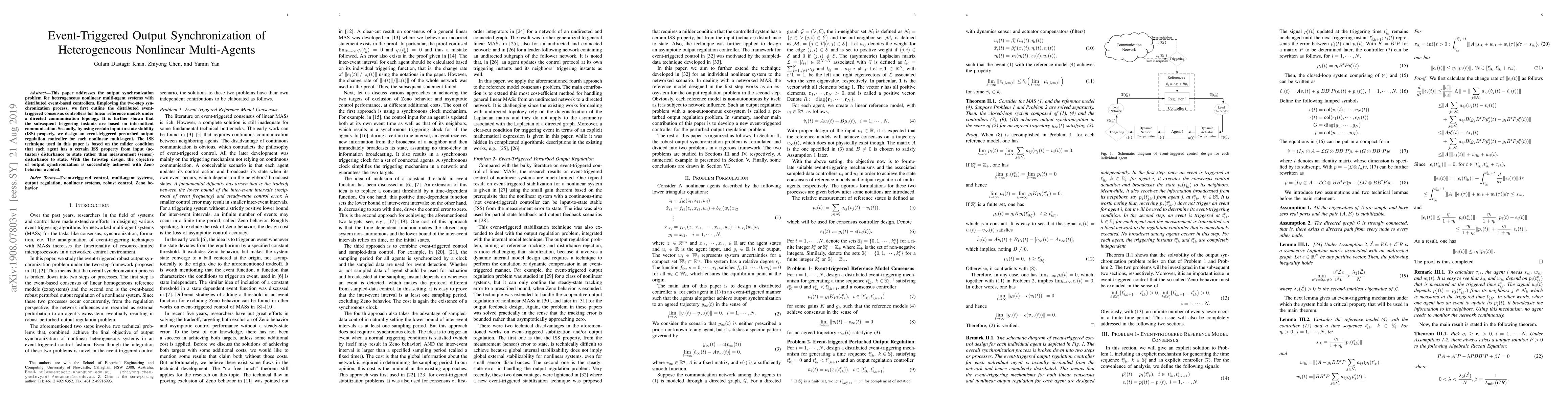 This paper tackles the output synchronization of heterogeneous nonlinear multi-agent systems using distributed event-based controllers. It introduces a two-step synchronization process, first designing event-triggered consensus controllers for linear models, followed by a perturbed output regulation controller for nonlinear agents based on input-to-state stability, achieving synchronization while avoiding Zeno behavior.