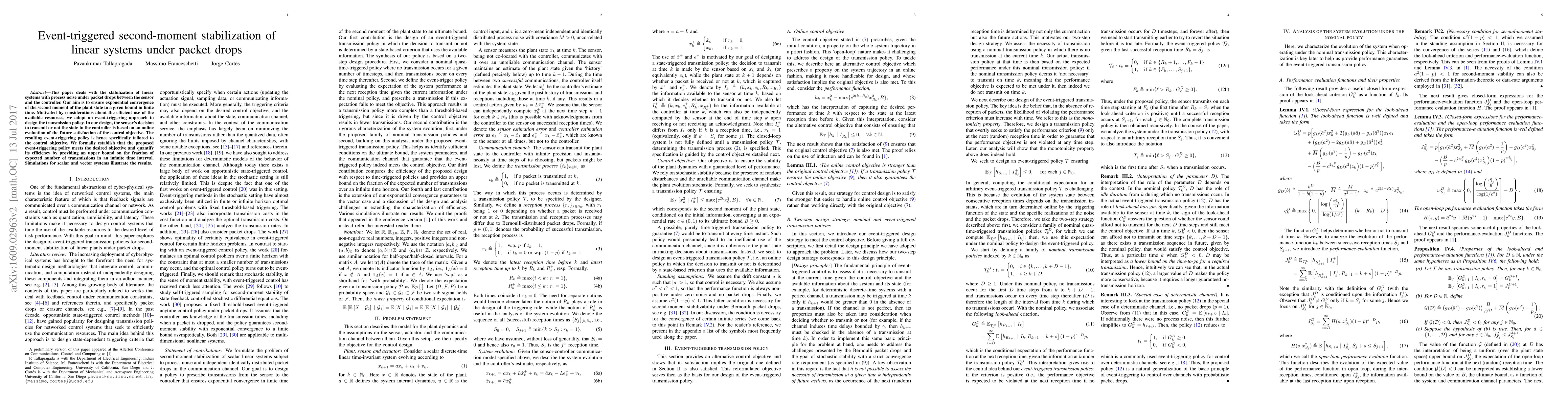 This paper deals with the stabilization of linear systems with process noise under packet drops between the sensor and the controller. Our aim is to ensure exponential convergence of the second moment of the plant state to a given bound in finite time. Motivated by considerations about the efficient use of the available resources, we adopt an event-triggering approach to design the transmission policy. In our design, the sensor's decision to transmit or not the state to the controller is based on an online evaluation of the future satisfaction of the control objective. The resulting event-triggering policy is hence specifically tailored to the control objective. We formally establish that the proposed event-triggering policy meets the desired objective and quantify its efficiency by providing an upper bound on the fraction of expected number of transmissions in an infinite time interval. Simulations for scalar and vector systems illustrate the results.