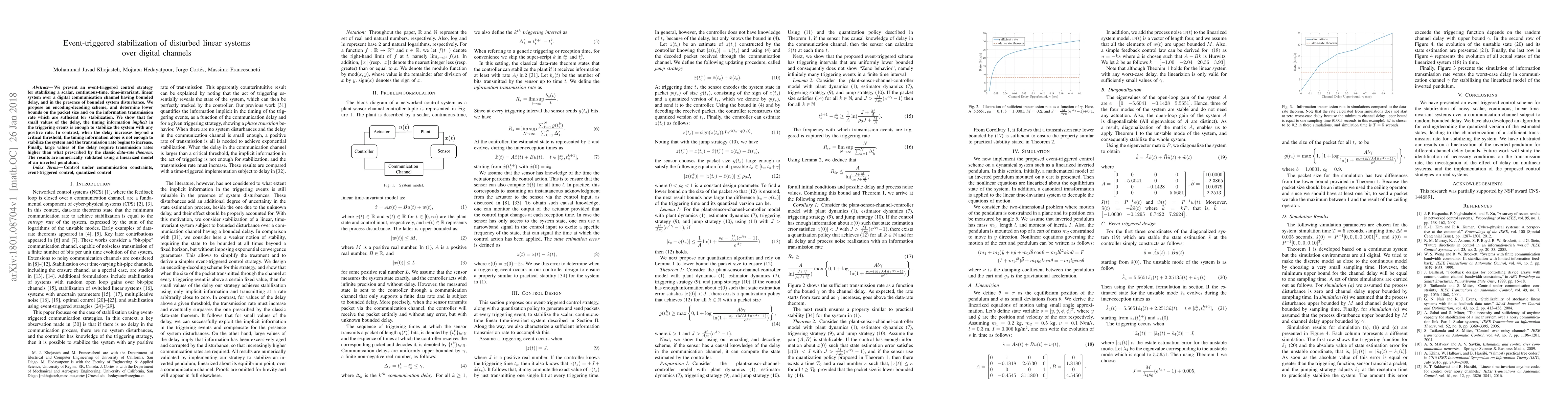 This paper proposes an event-triggered control strategy to stabilize linear systems over digital channels with bounded delays and disturbances. It determines optimal packet size and transmission rates for stabilization, showing that higher rates are needed for larger delays, challenging classic data-rate theorems.