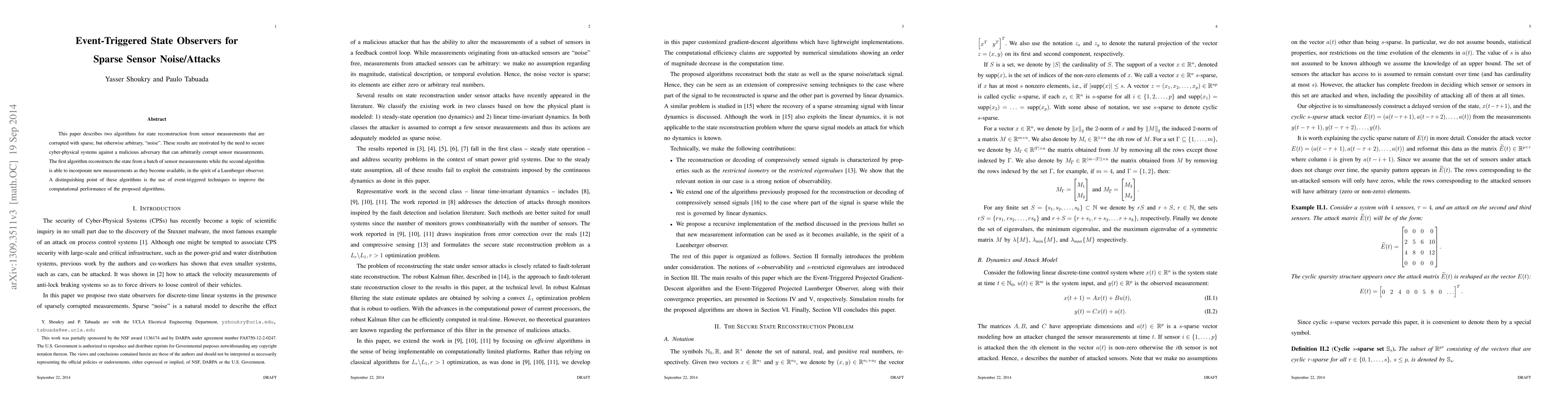 This paper describes two algorithms for state reconstruction from sensor measurements that are corrupted with sparse, but otherwise arbitrary, "noise". These results are motivated by the need to secure cyber-physical systems against a malicious adversary that can arbitrarily corrupt sensor measurements. The first algorithm reconstructs the state from a batch of sensor measurements while the second algorithm is able to incorporate new measurements as they become available, in the spirit of a Luenberger observer. A distinguishing point of these algorithms is the use of event-triggered techniques to improve the computational performance of the proposed algorithms.
