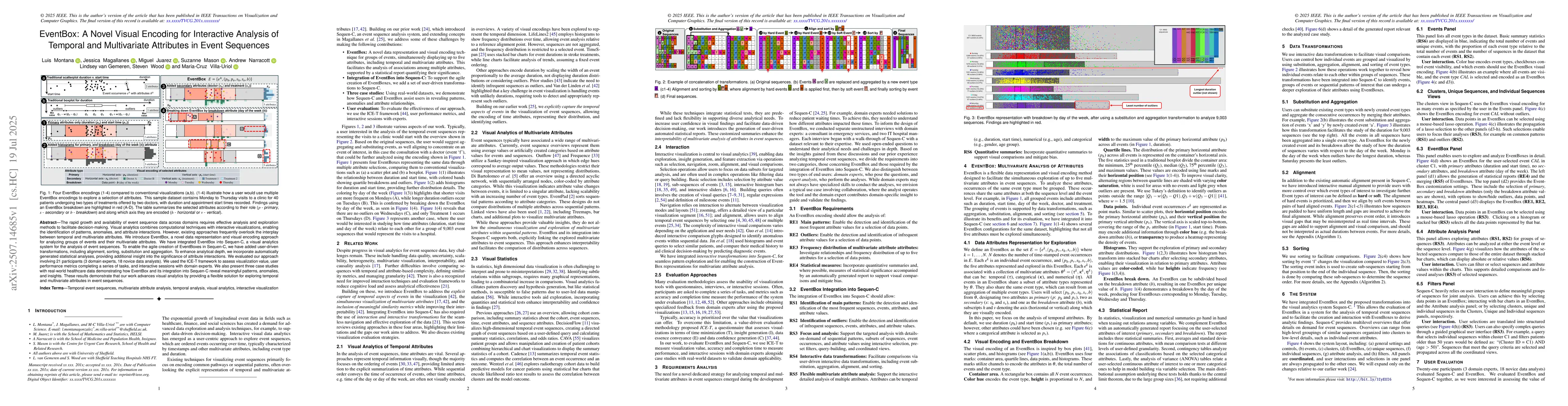 The rapid growth and availability of event sequence data across domains requires effective analysis and exploration methods to facilitate decision-making. Visual analytics combines computational techniques with interactive visualizations, enabling the identification of patterns, anomalies, and attribute interactions. However, existing approaches frequently overlook the interplay between temporal and multivariate attributes. We introduce EventBox, a novel data representation and visual encoding approach for analyzing groups of events and their multivariate attributes. We have integrated EventBox into Sequen-C, a visual analytics system for the analysis of event sequences. To enable the agile creation of EventBoxes in Sequen-C, we have added user-driven transformations, including alignment, sorting, substitution and aggregation. To enhance analytical depth, we incorporate automatically generated statistical analyses, providing additional insight into the significance of attribute interactions. We evaluated our approach involving 21 participants (3 domain experts, 18 novice data analysts). We used the ICE-T framework to assess visualization value, user performance metrics completing a series of tasks, and interactive sessions with domain experts. We also present three case studies with real-world healthcare data demonstrating how EventBox and its integration into Sequen-C reveal meaningful patterns, anomalies, and insights. These results demonstrate that our work advances visual analytics by providing a flexible solution for exploring temporal and multivariate attributes in event sequences.