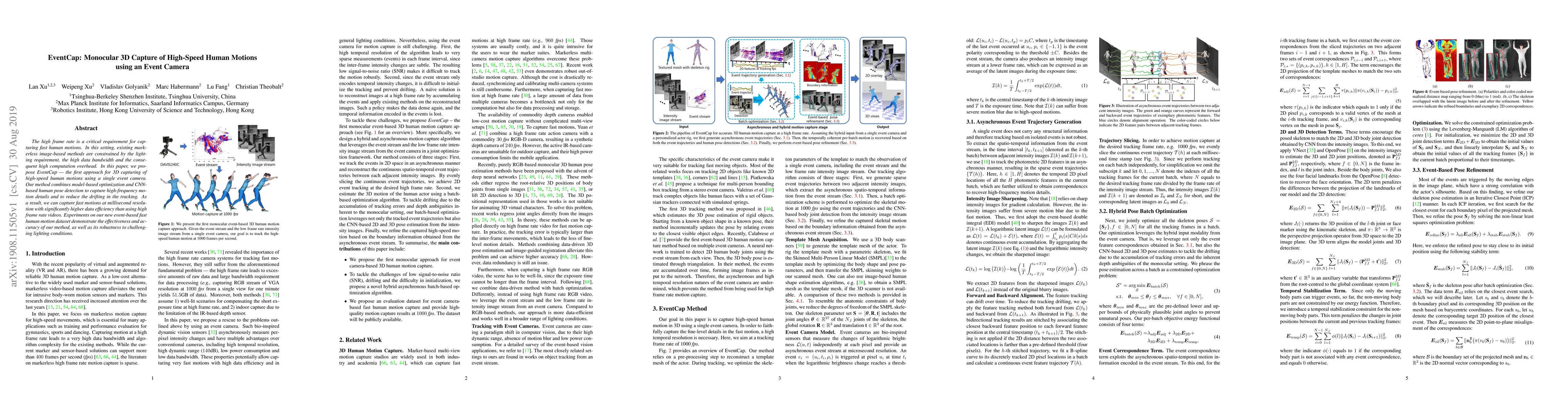 EventCap proposes a novel method for capturing high-speed human motions using a single event camera, combining model-based optimization with CNN-based pose detection to achieve millisecond resolution and high data efficiency, outperforming traditional high frame rate video methods. The approach demonstrates effectiveness and robustness in challenging lighting conditions.