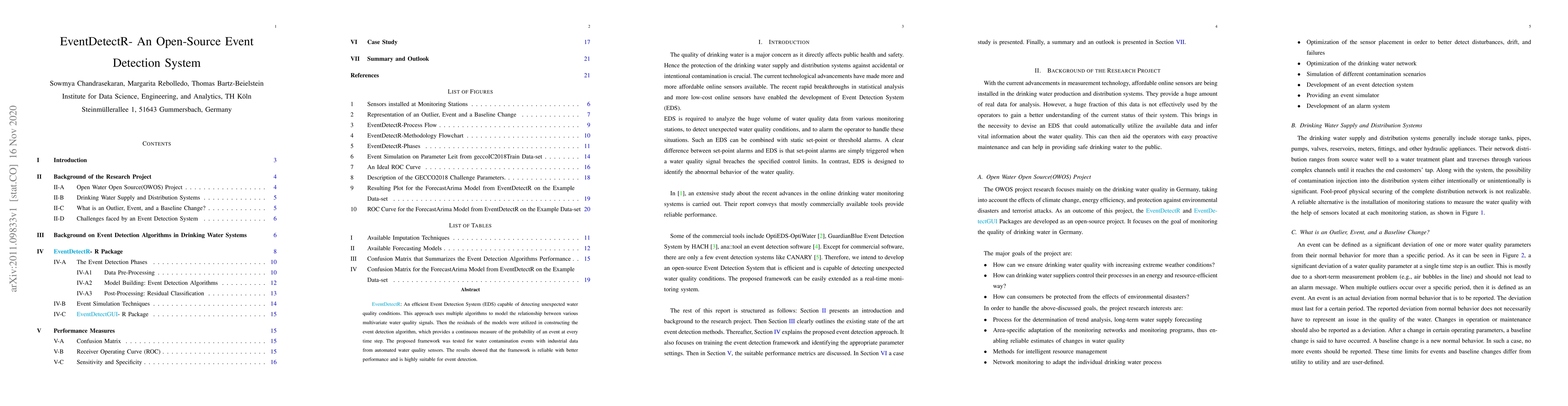 EventDetectR: An efficient Event Detection System (EDS) capable of detecting unexpected water quality conditions. This approach uses multiple algorithms to model the relationship between various multivariate water quality signals. Then the residuals of the models were utilized in constructing the event detection algorithm, which provides a continuous measure of the probability of an event at every time step. The proposed framework was tested for water contamination events with industrial data from automated water quality sensors. The results showed that the framework is reliable with better performance and is highly suitable for event detection.