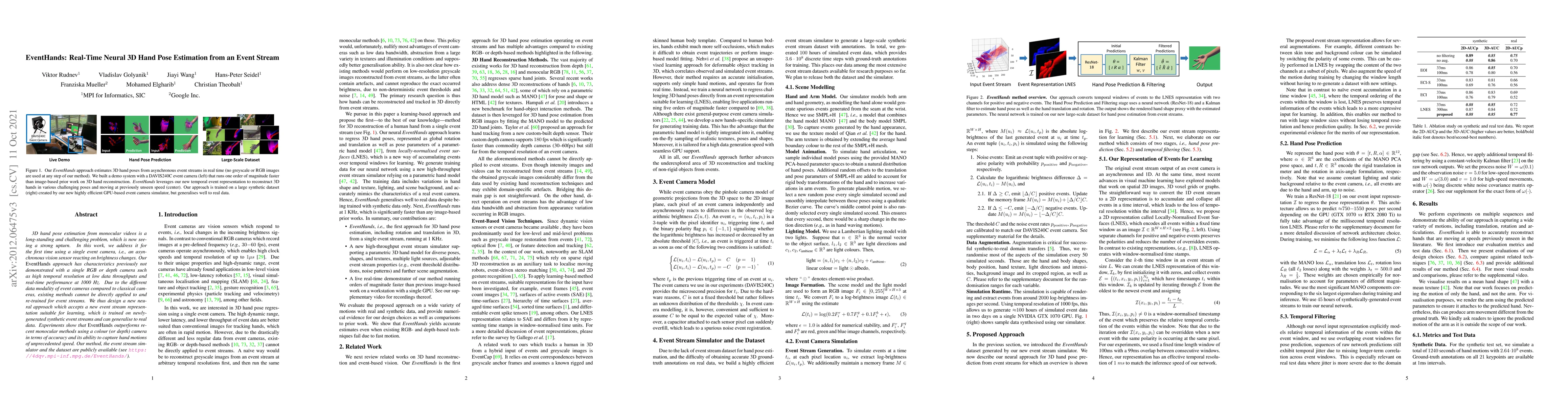 This paper introduces EventHands, a real-time 3D hand pose estimation method that uses event cameras to capture high-speed hand motions with unprecedented accuracy.