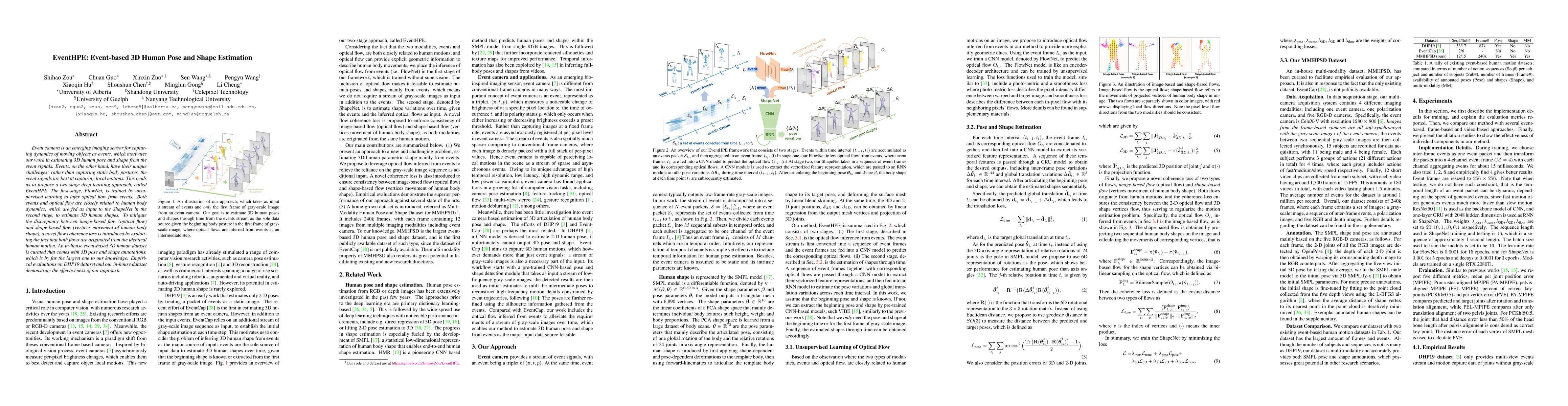 EventHPE is a two-stage deep learning method for estimating 3D human pose and shape from event camera data. It uses an unsupervised learning approach to infer optical flow from events, followed by a ShapeNet stage to estimate 3D human shapes, employing a novel flow coherence loss to bridge the gap between optical and shape-based flows.