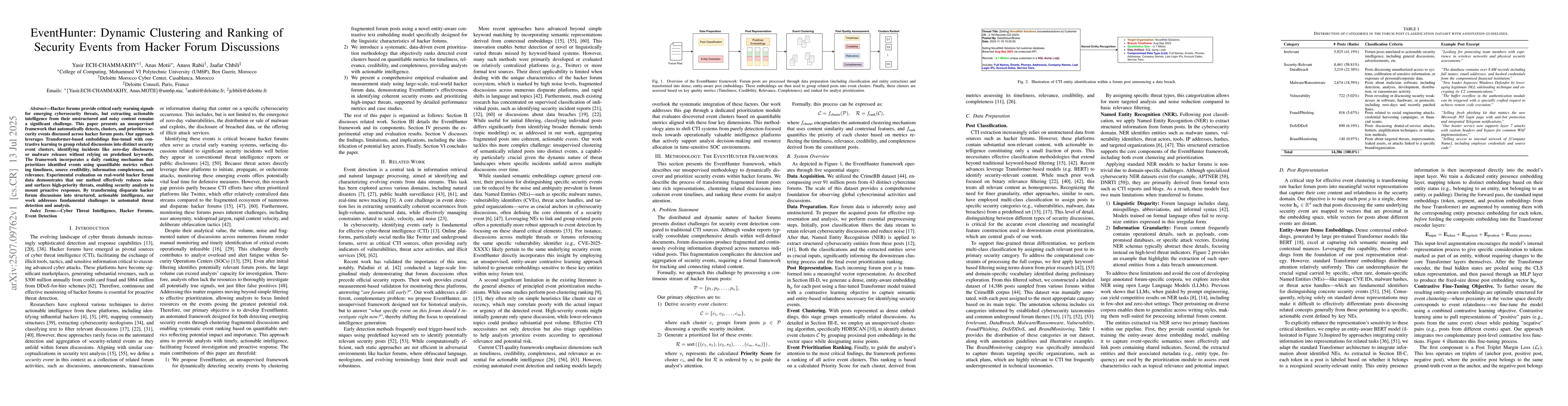 EventHunter integrates entity-aware contrastive embeddings tailored for security semantics, robust density-based clustering, and a systematic prioritization mechanism based on CTI quality metrics to transform disparate hacker forum discussions into structured, actionable intelligence.