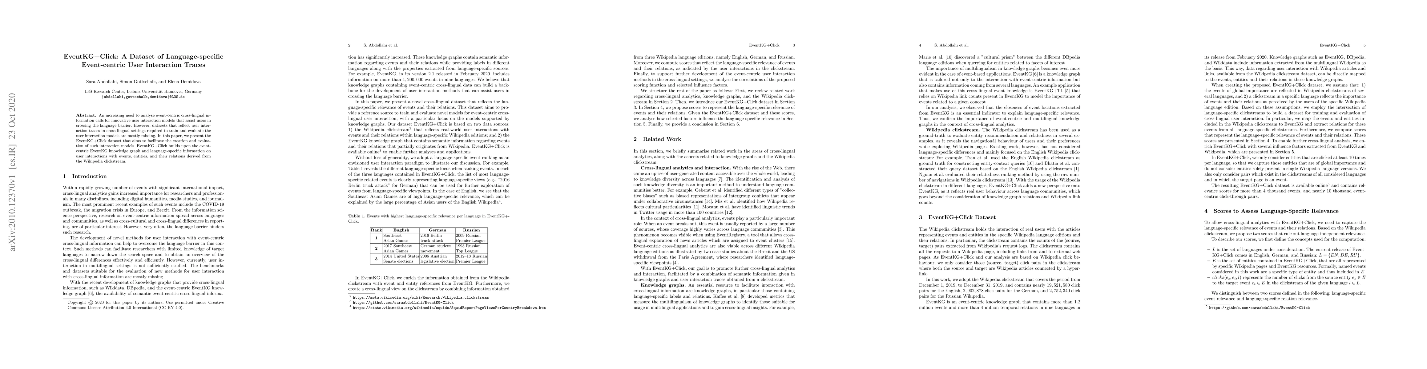 The EventKG+Click dataset provides language-specific event-centric user interaction traces to aid in cross-lingual analysis, addressing the lack of datasets for training and evaluating cross-lingual interaction models. It combines event-centric knowledge graph data with language-specific interaction information from Wikipedia clickstreams.