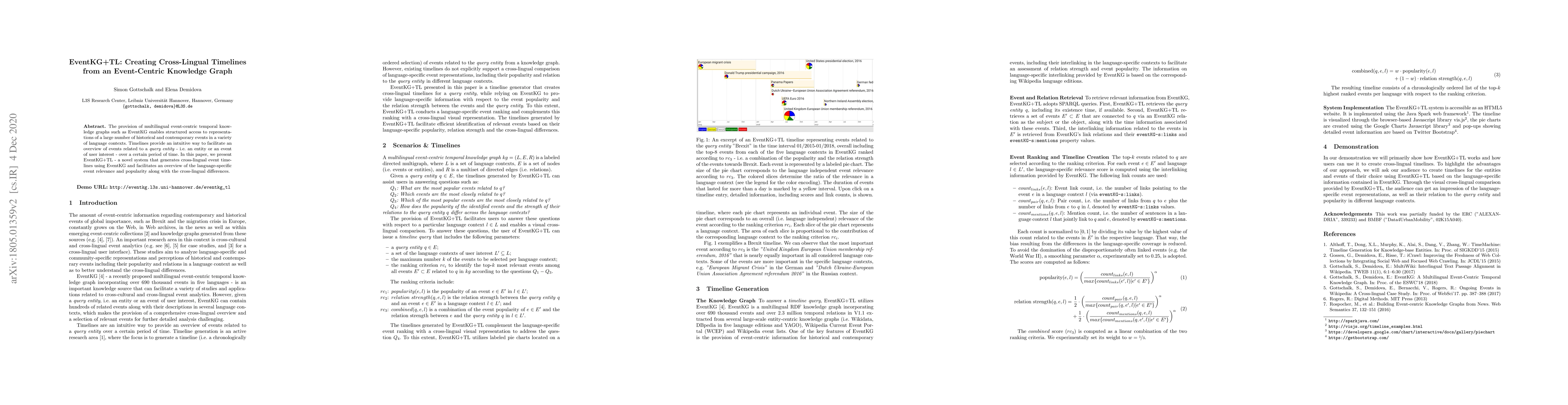 EventKG+TL is a system that generates multilingual event timelines from EventKG, providing insights into language-specific event relevance and cross-lingual differences. It aims to offer a structured overview of historical and contemporary events in various language contexts.