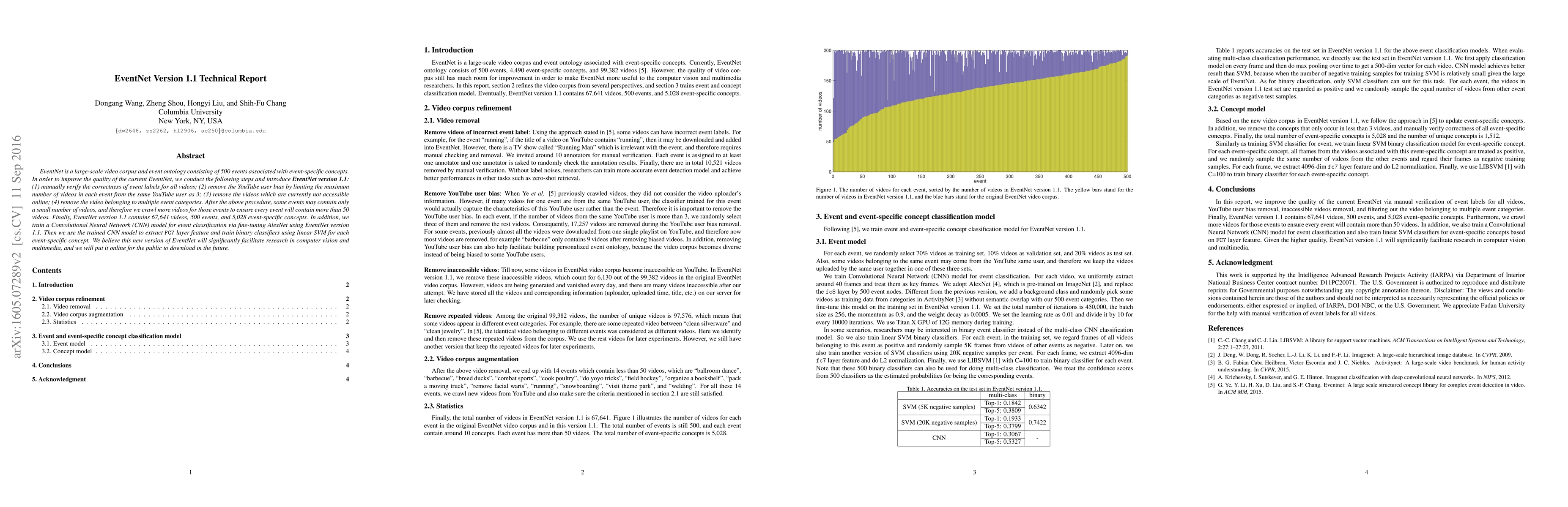 EventNet is a large-scale video corpus and event ontology consisting of 500 events associated with event-specific concepts. In order to improve the quality of the current EventNet, we conduct the following steps and introduce EventNet version 1.1: (1) manually verify the correctness of event labels for all videos; (2) remove the YouTube user bias by limiting the maximum number of videos in each event from the same YouTube user as 3; (3) remove the videos which are currently not accessible online; (4) remove the video belonging to multiple event categories. After the above procedure, some events may contain only a small number of videos, and therefore we crawl more videos for those events to ensure every event will contain more than 50 videos. Finally, EventNet version 1.1 contains 67,641 videos, 500 events, and 5,028 event-specific concepts. In addition, we train a Convolutional Neural Network (CNN) model for event classification via fine-tuning AlexNet using EventNet version 1.1. Then we use the trained CNN model to extract FC7 layer feature and train binary classifiers using linear SVM for each event-specific concept. We believe this new version of EventNet will significantly facilitate research in computer vision and multimedia, and will put it online for public downloading in the future.