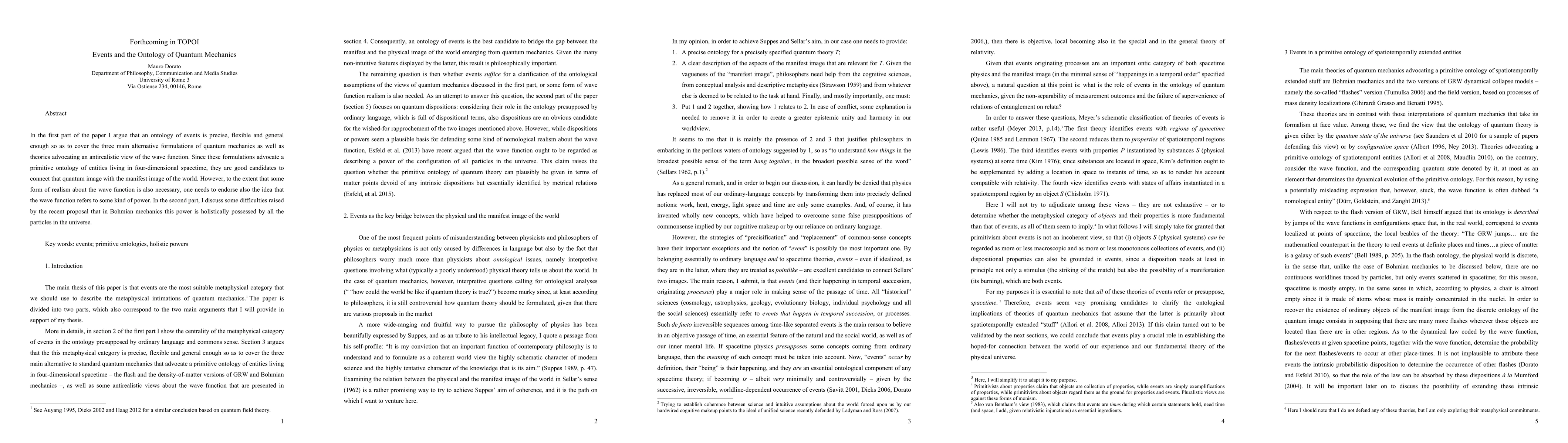 In the first part of the paper I argue that an ontology of events is precise, flexible and general enough so as to cover the three main alternative formulations of quantum mechanics as well as theories advocating an antirealistic view of the wave function. Since these formulations advocate a primitive ontology of entities living in four-dimensional spacetime, they are good candidates to connect that quantum image with the manifest image of the world. However, to the extent that some form of realism about the wave function is also necessary, one needs to endorse also the idea that the wave function refers to some kind of power. In the second part, I discuss some difficulties raised by the recent proposal that in Bohmian mechanics this power is holistically possessed by all the particles in the universe.