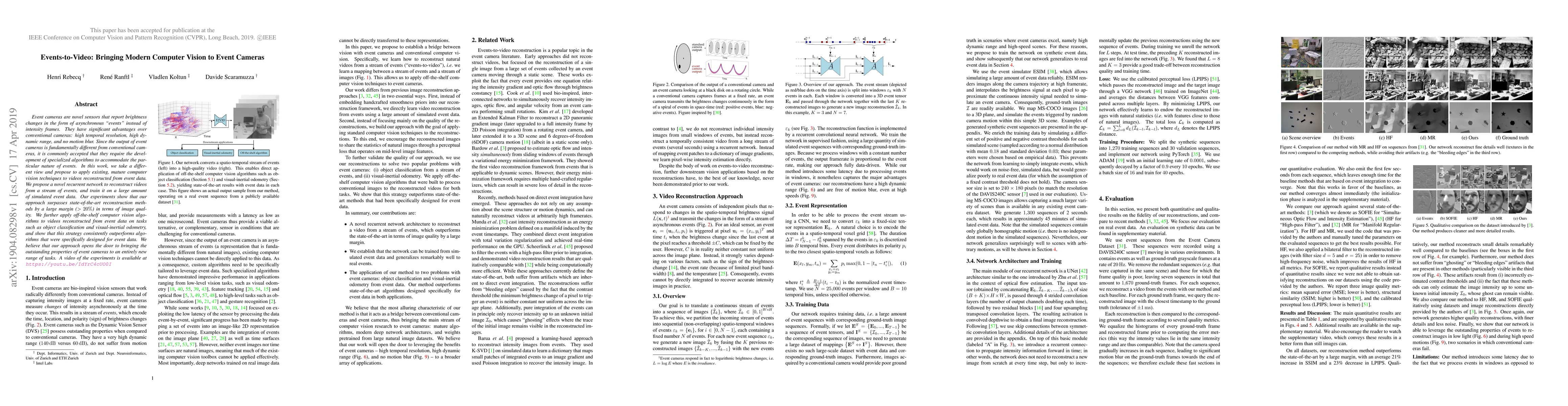 The paper proposes applying existing computer vision techniques to videos reconstructed from event data using a novel recurrent network, trained on simulated event data.