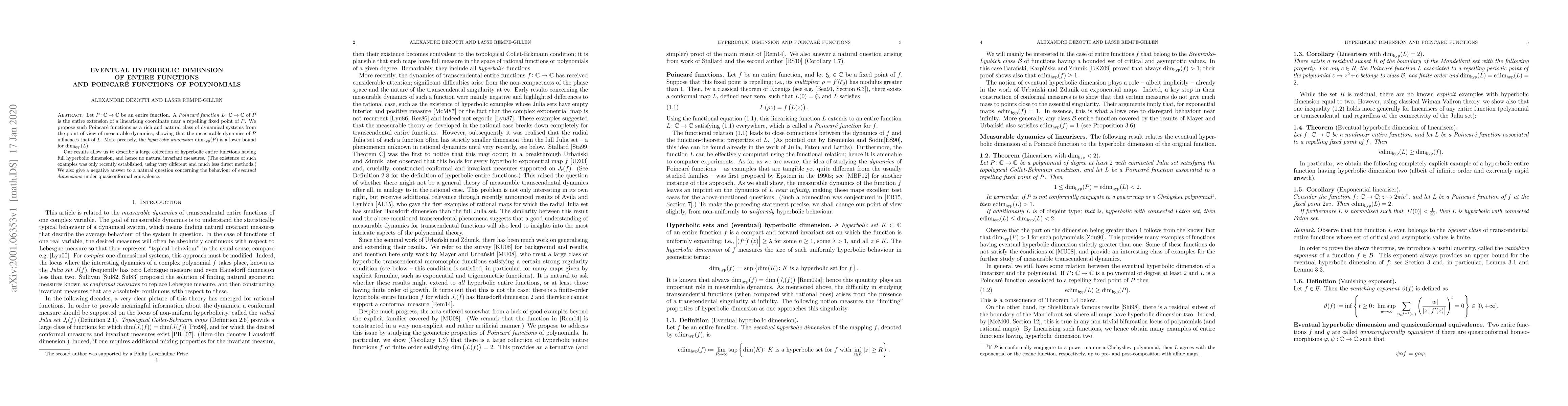 Let $ P \colon \mathbb{C} \to \mathbb{C} $ be an entire function. A Poincar\'e function $ L \colon \mathbb{C} \to \mathbb{C} $ of $ P $ is the entire extension of a linearising coordinate near a repelling fixed point of $ P $. We propose such Poincar\'e functions as a rich and natural class of dynamical systems from the point of view of measurable dynamics, showing that the measurable dynamics of $ P $ influences that of $ L $. More precisely, the hyperbolic dimension of $ P $ is a lower bound for the hyperbolic dimension of $ L $. Our results allow us to describe a large collection of hyperbolic entire functions having full hyperbolic dimension, and hence no natural invariant measures. (The existence of such examples was only recently established, using very different and much less direct methods.) We also give a negative answer to a natural question concerning the behaviour of eventual dimensions under quasiconformal equivalence.