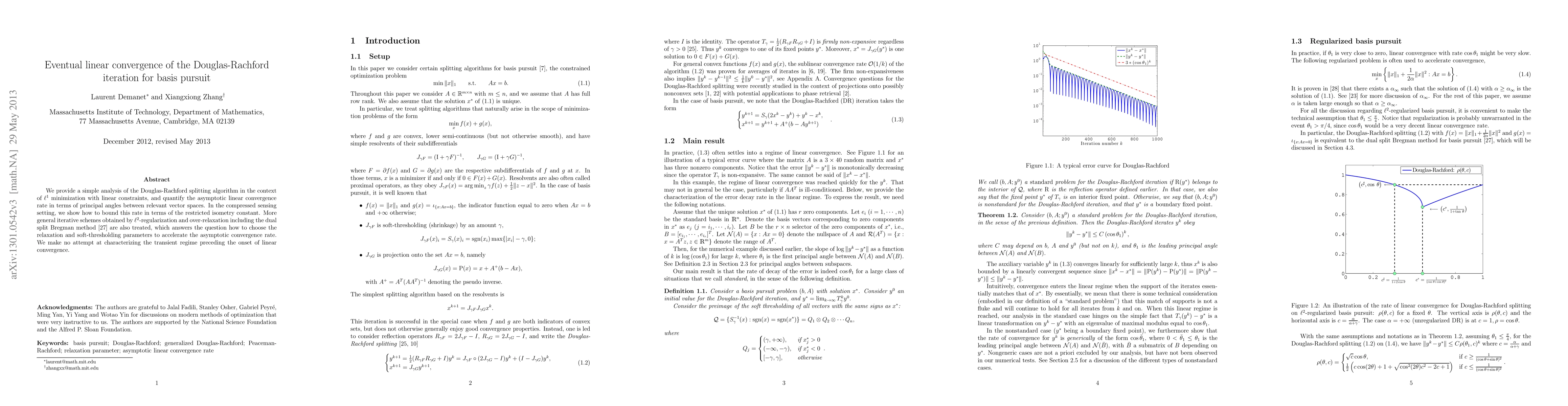 We provide a simple analysis of the Douglas-Rachford splitting algorithm in the context of $\ell^1$ minimization with linear constraints, and quantify the asymptotic linear convergence rate in terms of principal angles between relevant vector spaces. In the compressed sensing setting, we show how to bound this rate in terms of the restricted isometry constant. More general iterative schemes obtained by $\ell^2$-regularization and over-relaxation including the dual split Bregman method are also treated, which answers the question how to choose the relaxation and soft-thresholding parameters to accelerate the asymptotic convergence rate. We make no attempt at characterizing the transient regime preceding the onset of linear convergence.