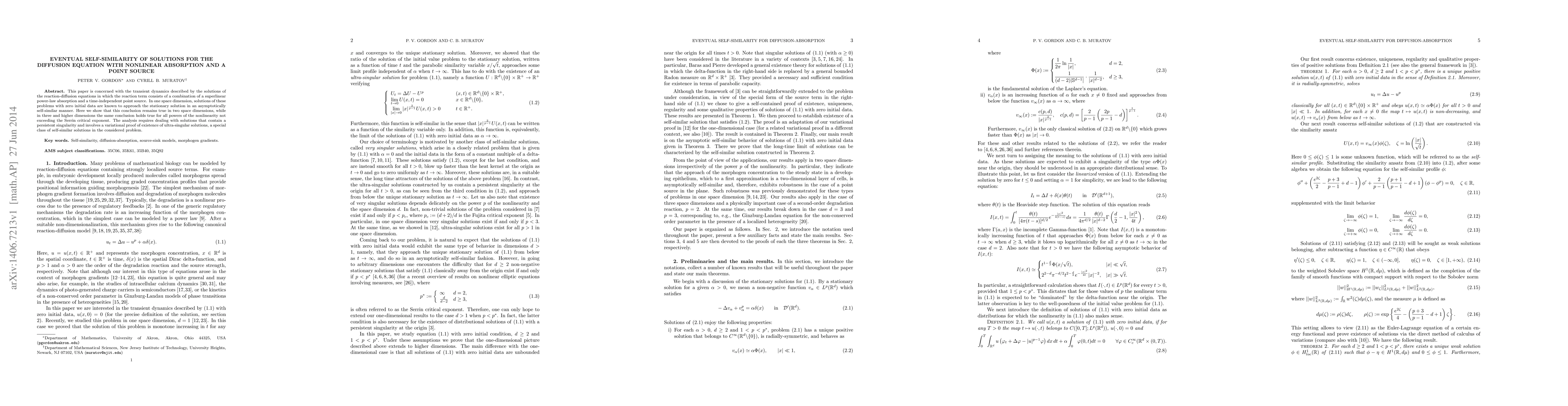 Research shows that solutions to a diffusion equation with nonlinear absorption and a point source approach a self-similar pattern in two dimensions and higher, up to a certain power-law limit.