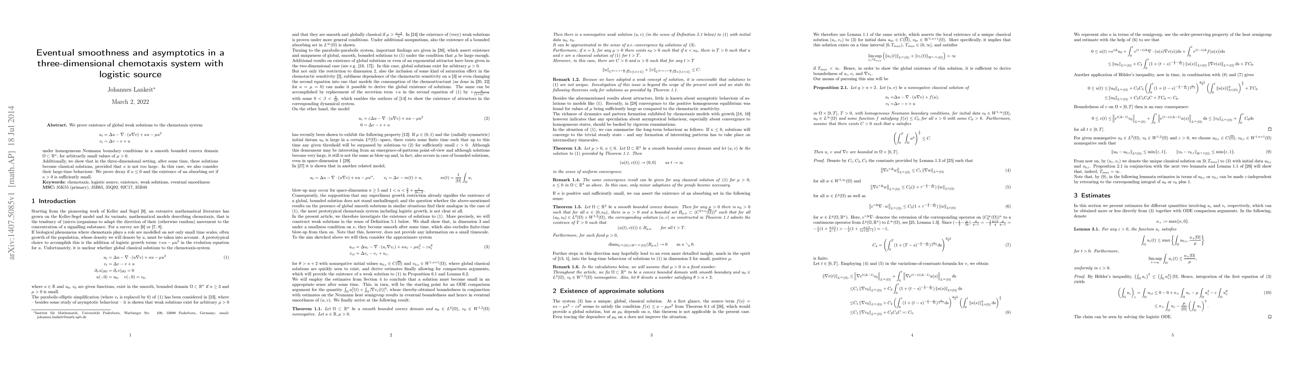 This paper proves the existence of global weak solutions to a three-dimensional chemotaxis system with a logistic source and demonstrates that these solutions become classical over time in three dimensions, provided a certain parameter is not excessively large. It also examines the long-term behavior, showing decay for negative or zero parameters and an absorbing set for sufficiently small positive parameters.