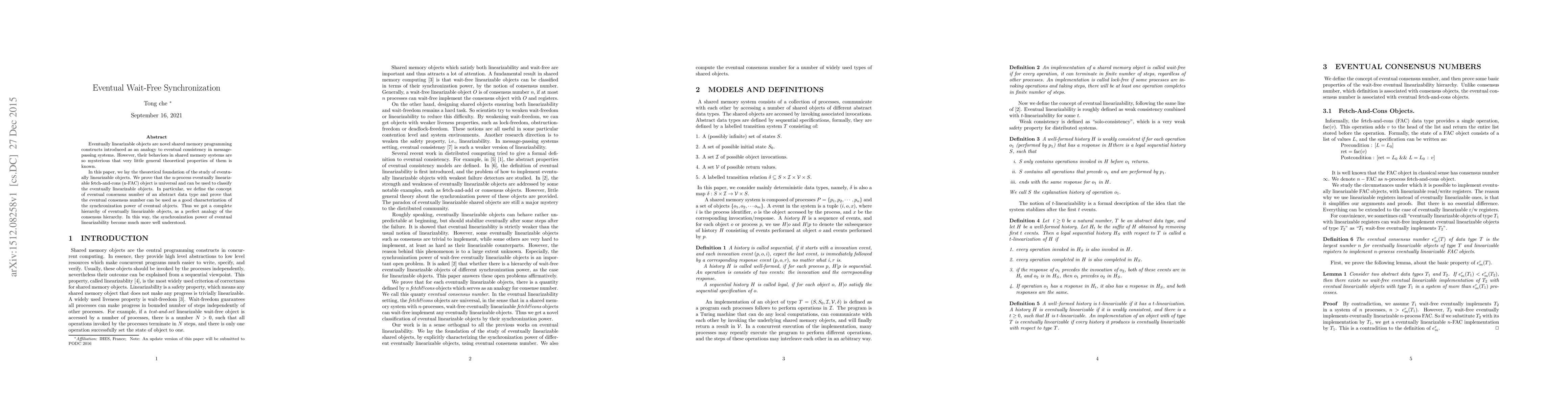 This paper establishes the theoretical foundation for eventually linearizable objects in shared memory systems, proving that the n-process fetch-and-cons (n-FAC) object is universal. It introduces the concept of eventual consensus number to characterize the synchronization power of these objects, creating a hierarchy analogous to the consensus hierarchy.