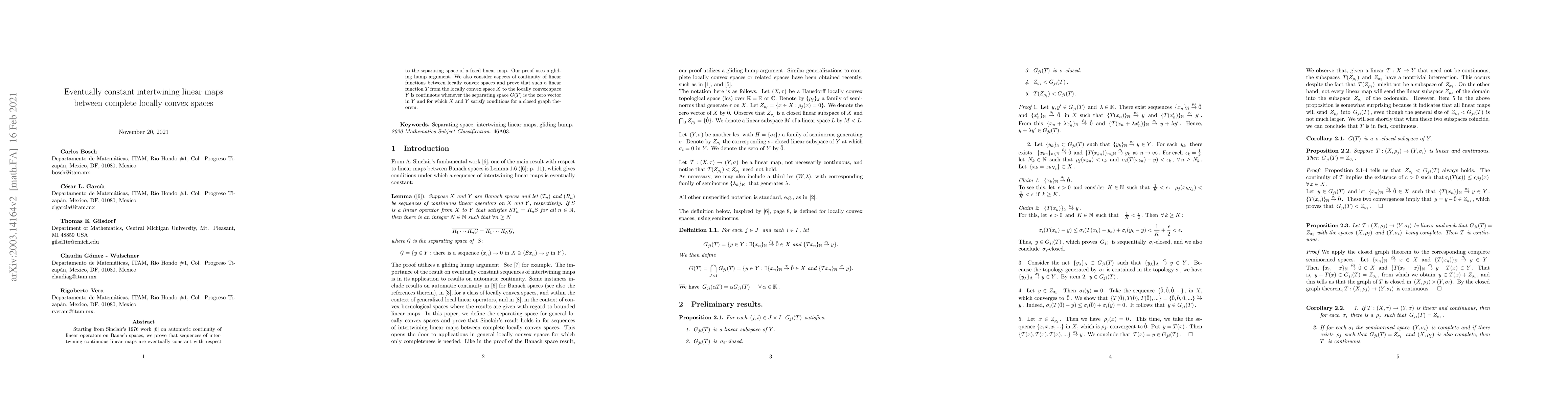 Starting from Sinclair's 1976 work {\it Automatic Continuity of Linear Operators}, Cambridge University Press, (1976), on automatic continuity of linear operators on Banach spaces, we prove that sequences of intertwining continuous linear maps are eventually constant with respect to the separating space of a fixed linear map. Our proof uses a gliding hump argument. We also consider aspects of continuity of linear functions between locally convex spaces and prove that such that a linear function $T$ from the locally convex space $X$ to the locally convex space $Y$ is continuous whenever the separating space $G(T)$ is the zero vector in $Y$ and for which $X$ and $Y$ satisfy conditions for a closed graph theorem.