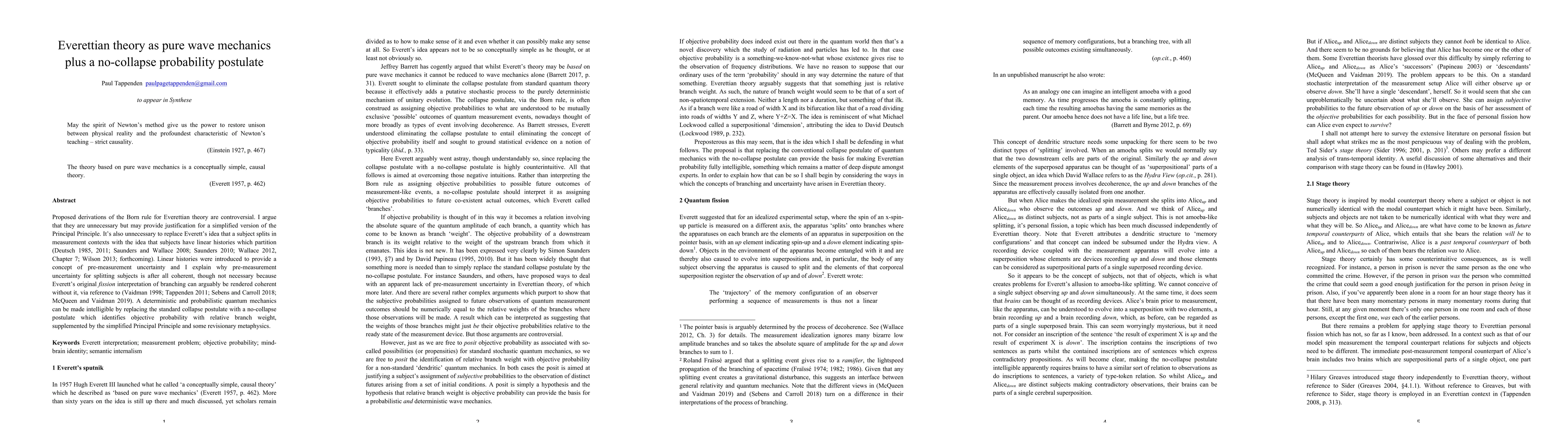Proposed derivations of the Born rule for Everettian theory are controversial. I argue that they are unnecessary but may provide justification for a simplified version of the Principal Principle. It's also unnecessary to replace Everett's idea that a subject splits in measurement contexts with the idea that subjects have linear histories which partition: Deutsch 1985, 2011; Saunders and Wallace 2008; Saunders 2010; Wallace 2012, Chapter 7; Wilson 2013, forthcoming. Linear histories were introduced to provide a concept of pre-measurement uncertainty and I explain why pre-measurement uncertainty for splitting subjects is after all coherent, though not necessary because Everett's original fission interpretation of branching can arguably be rendered coherent without it, via reference to Vaidman 1998; Tappenden 2011; Sebens and Carroll 2018; McQueen and Vaidman 2019. A deterministic and probabilistic quantum mechanics can be made intelligible by replacing the standard collapse postulate with a no-collapse postulate which identifies objective probability with relative branch weight, supplemented by the simplified Principal Principle and some revisionary metaphysics.