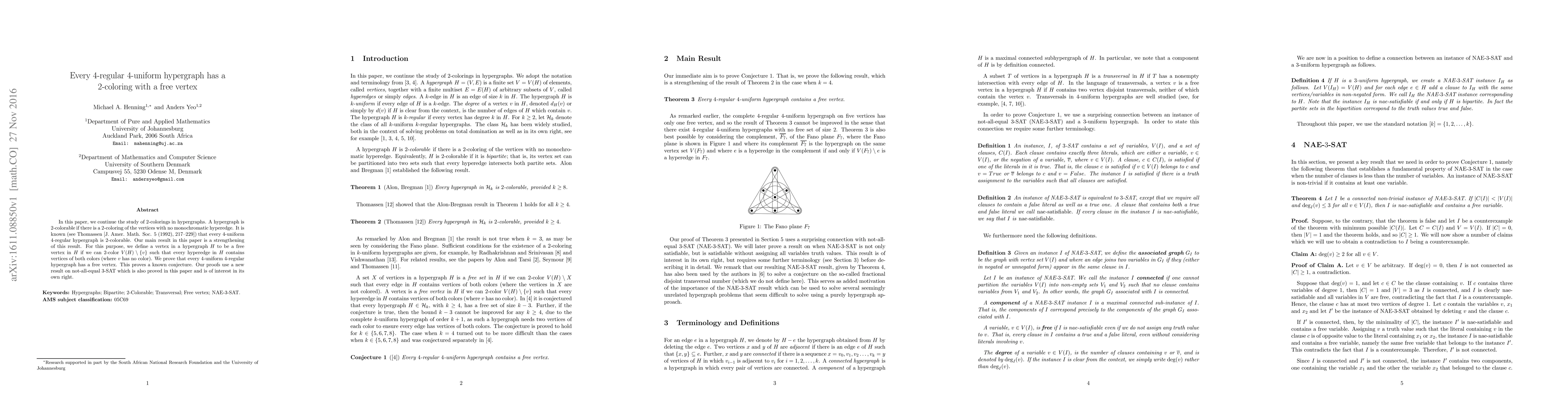 In this paper, we continue the study of $2$-colorings in hypergraphs. A hypergraph is $2$-colorable if there is a $2$-coloring of the vertices with no monochromatic hyperedge. It is known (see Thomassen [J. Amer. Math. Soc. 5 (1992), 217--229]) that every $4$-uniform $4$-regular hypergraph is $2$-colorable. Our main result in this paper is a strengthening of this result. For this purpose, we define a vertex in a hypergraph $H$ to be a free vertex in $H$ if we can $2$-color $V(H) \setminus \{v\}$ such that every hyperedge in $H$ contains vertices of both colors (where $v$ has no color). We prove that every $4$-uniform $4$-regular hypergraph has a free vertex. This proves a known conjecture. Our proofs use a new result on not-all-equal $3$-SAT which is also proved in this paper and is of interest in its own right.
