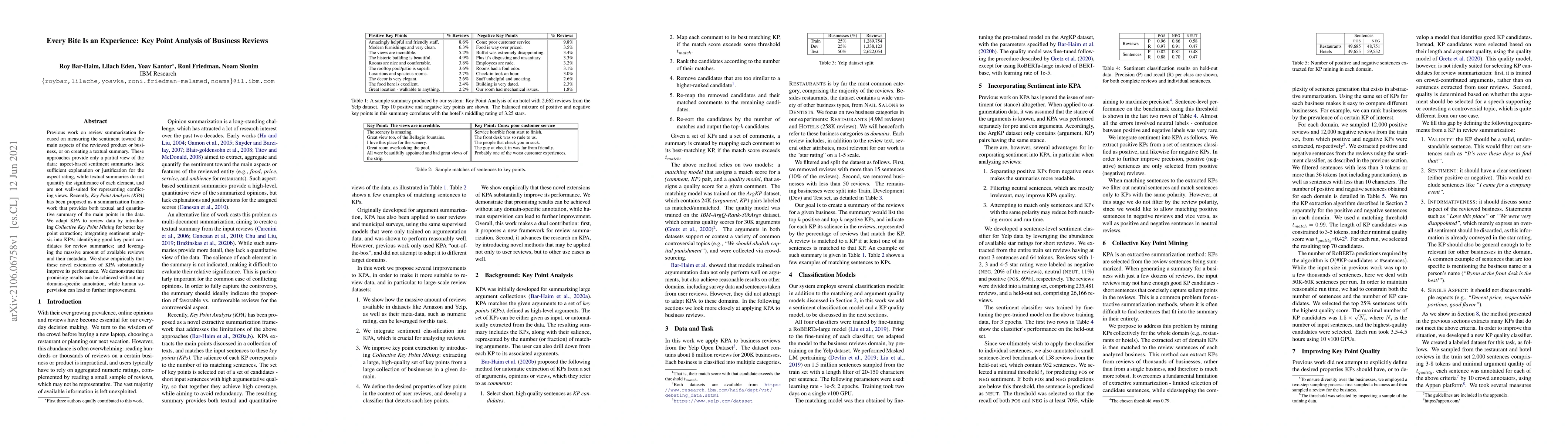 This paper adapts Key Point Analysis (KPA) to summarize business reviews, enhancing it with Collective Key Point Mining, integrated sentiment analysis, and leveraging large review datasets. The proposed method provides both textual and quantitative summaries, offering a more comprehensive view than traditional sentiment or textual summaries.