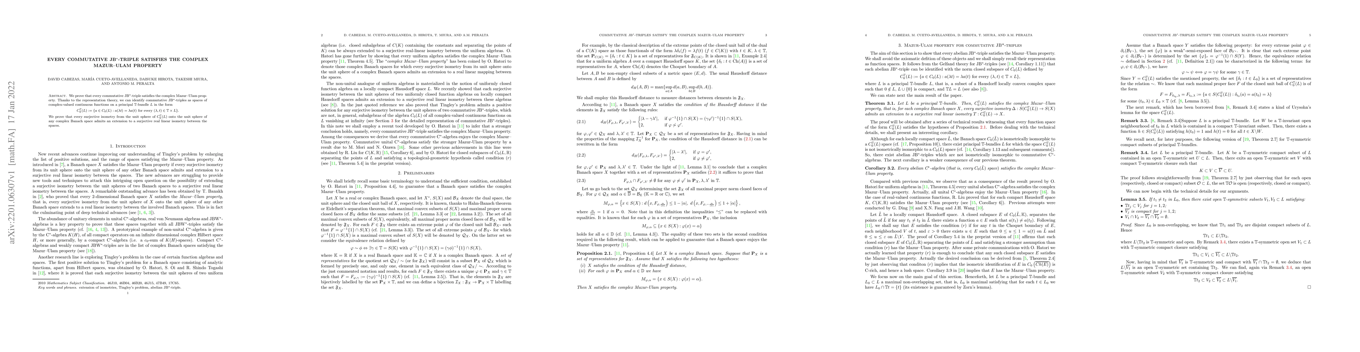 This paper proves that every commutative JB$^*$-triple satisfies the complex Mazur--Ulam property, identifying these triples as spaces of complex-valued continuous functions on a principal $\mathbb{T}$-bundle, and showing that surjective isometries between their unit spheres can be extended to surjective real linear isometries.