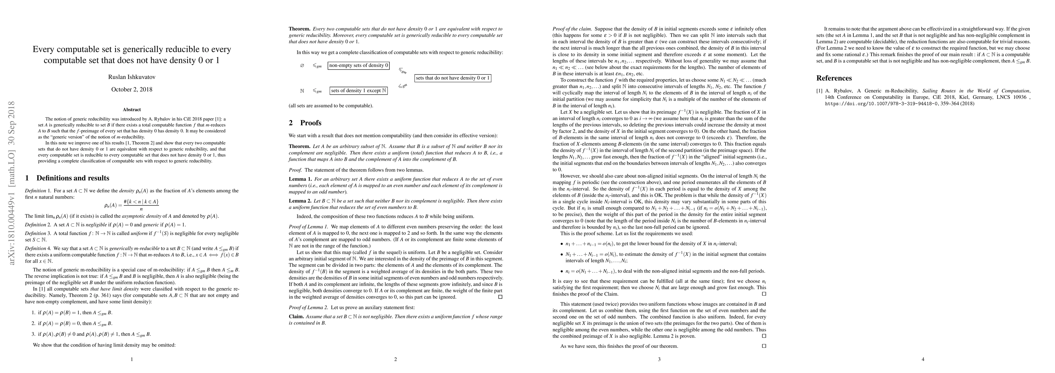 Summary: This paper proves that every computable set can be generically reduced to any other computable set that does not have density 0 or 1, establishing a complete classification of such sets with respect to generic reducibility. The result extends previous findings on the notion of generic reducibility introduced by Rybalov.