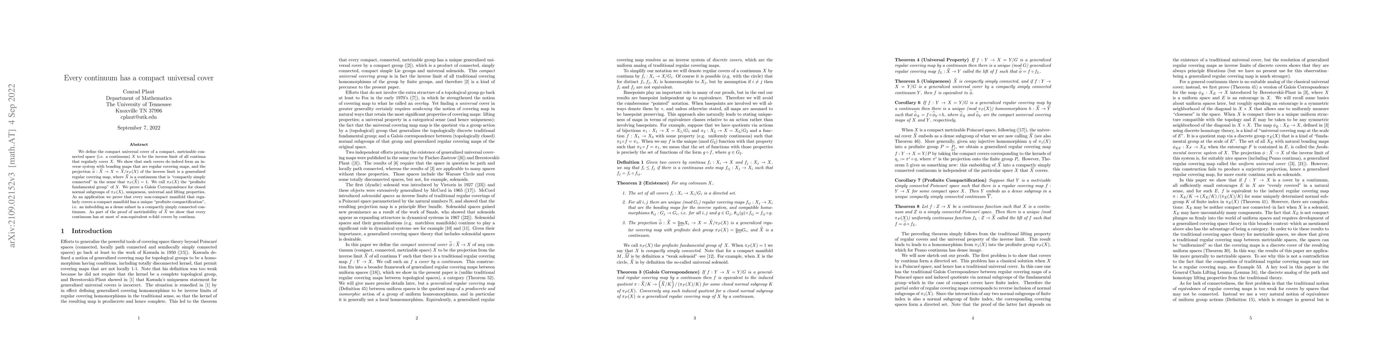 This paper establishes the existence of a compact universal cover for any compact, metrizable connected space (continuum) through the inverse limit of all continua that regularly cover it. It demonstrates a Galois Correspondence and proves that every non-compact manifold that regularly covers a compact manifold can be uniquely embedded in a compactly simply connected continuum.