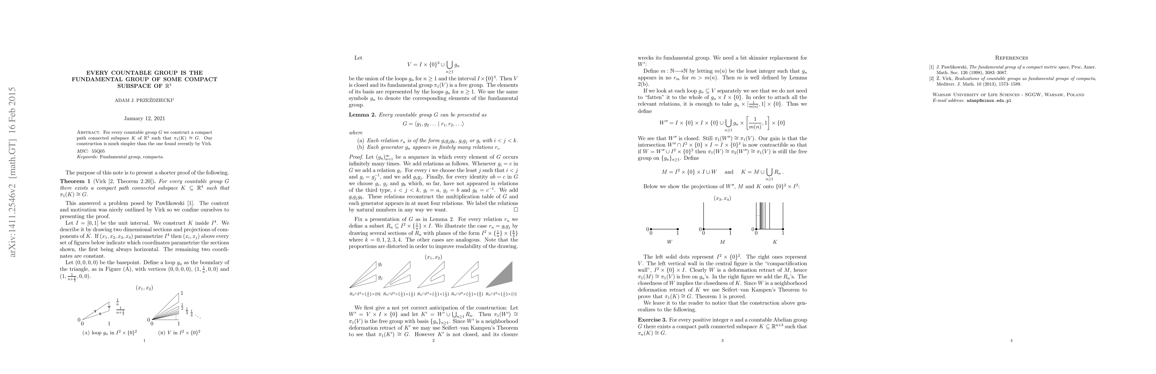 For every countable group G we construct a compact path connected subspace K of R^4 whose fundamental group is isomorphic to G. Our construction is much simpler than the one found recently by Virk.