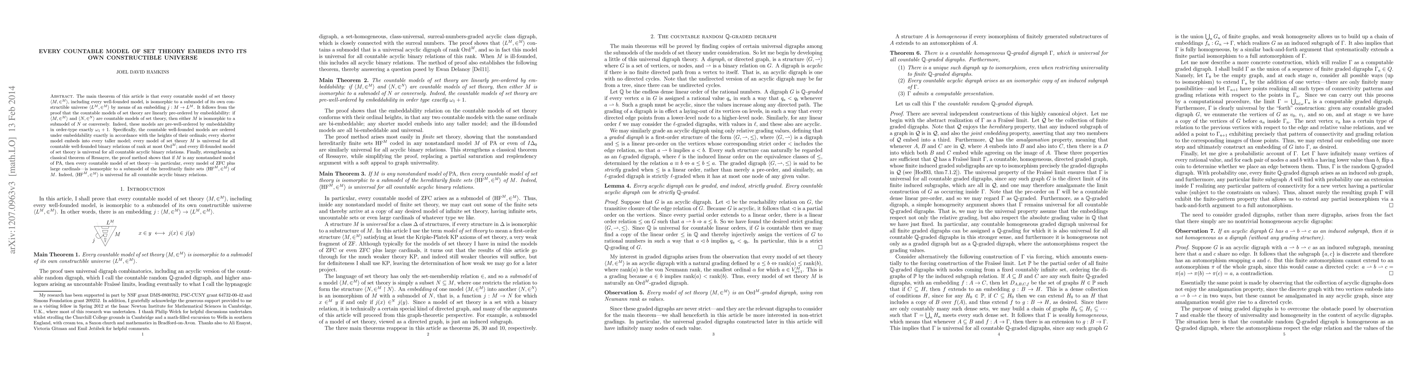 This paper proves that every countable model of set theory embeds into its own constructible universe, establishing an embedding $j:M\to L^M$ that is elementary for quantifier-free assertions. The proof leverages universal digraph combinatorics and shows that countable models are linearly pre-ordered by embeddability.
