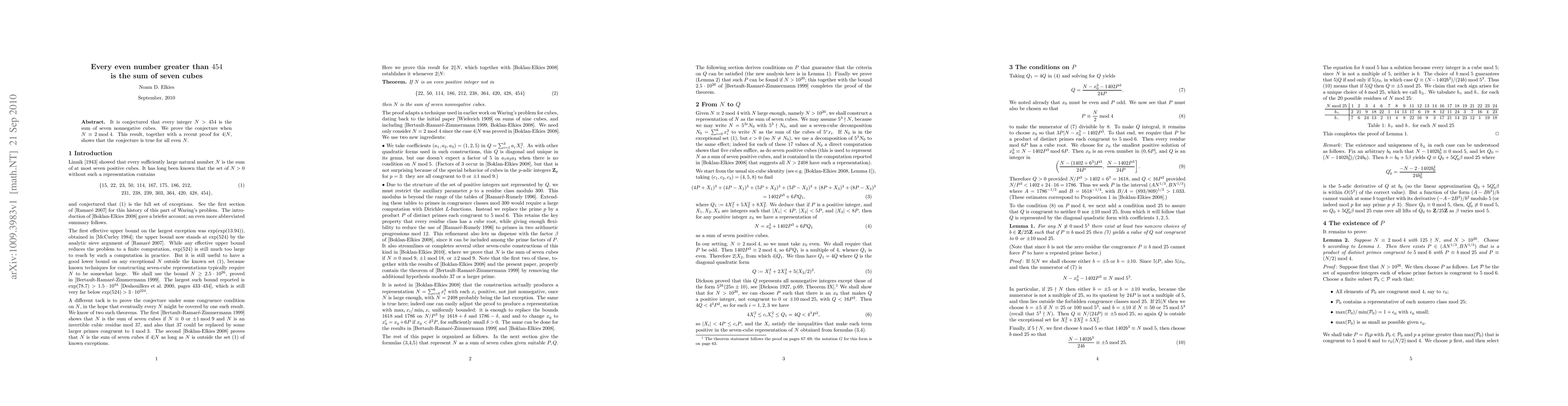 This paper proves that every even integer greater than 454 can be expressed as the sum of seven nonnegative cubes, completing the conjecture for all even numbers. This result complements a recent proof for even numbers divisible by four.