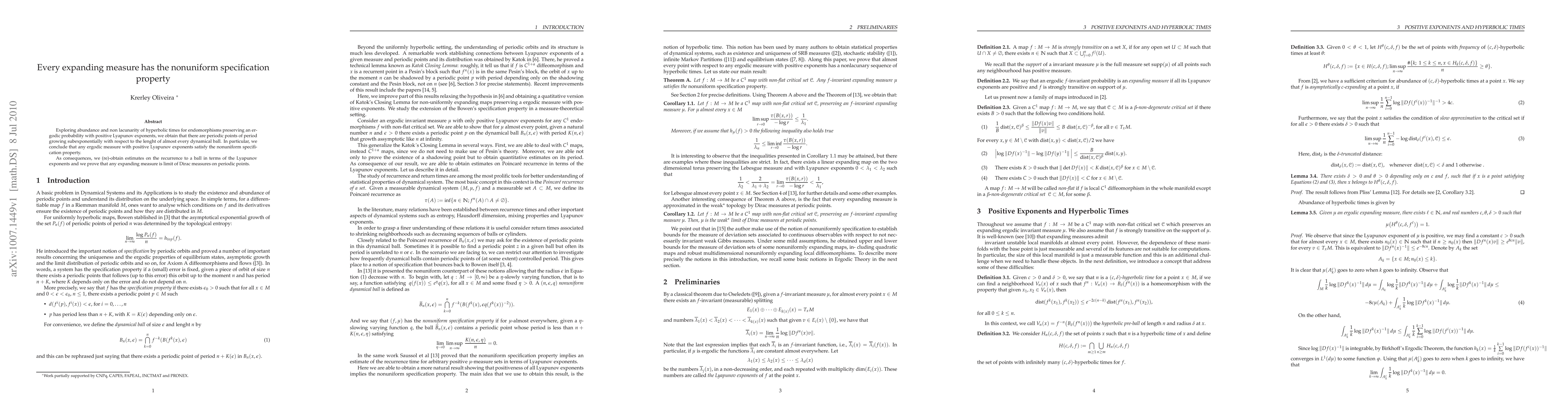 Exploring abundance and non lacunarity of hyperbolic times for endomorphisms preserving an ergodic probability with positive Lyapunov exponents, we obtain that there are periodic points of period growing sublinearly with respect to the lenght of almost every dynamical ball. In particular, we conclude that any ergodic measure with positive Lyapunov exponents satisfy the nonuniform specification property. As consequences, we (re)-obtain estimates on the recurrence to a ball in terms of the Lyapunov exponents and we prove that any expanding measure is limit of Dirac measures on periodic points.