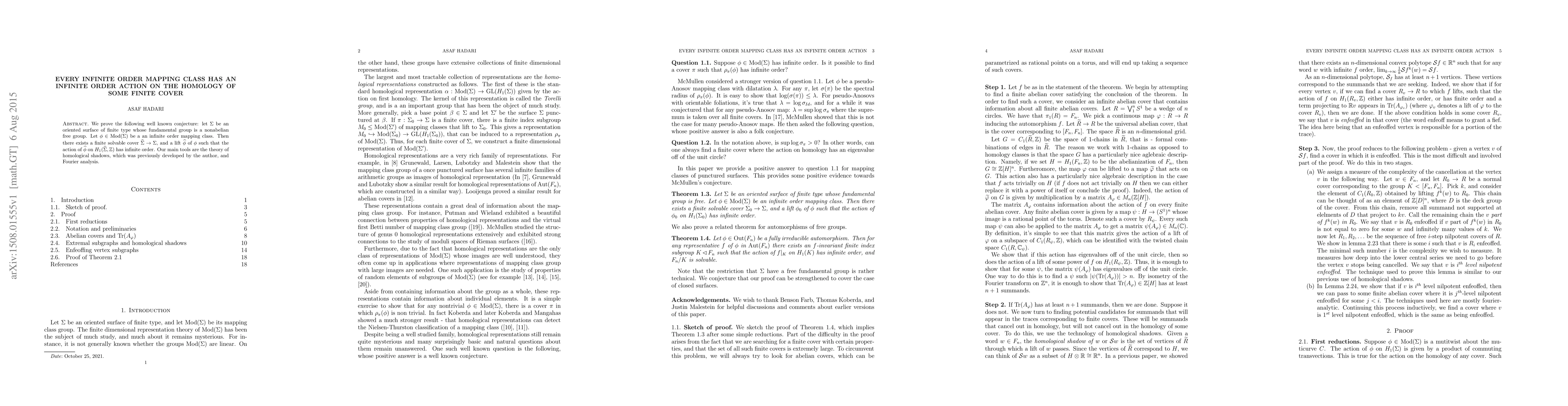 We prove the following well known conjecture: let $\Sigma$ be an oriented surface of finite type whose fundamental group is a nonabelian free group. Let $\phi \in \textup{Mod}(\Sigma)$ be a an infinite order mapping class. Then there exists a finite solvable cover $\widehat{\Sigma} \to \Sigma$, and a lift $\widehat{\phi}$ of $\phi$ such that the action of $\widehat{\phi}$ on $H_1(\widehat{\Sigma}, \mathbb{Z})$ has infinite order. Our main tools are the theory of homological shadows, which was previously developed by the author, and Fourier analysis