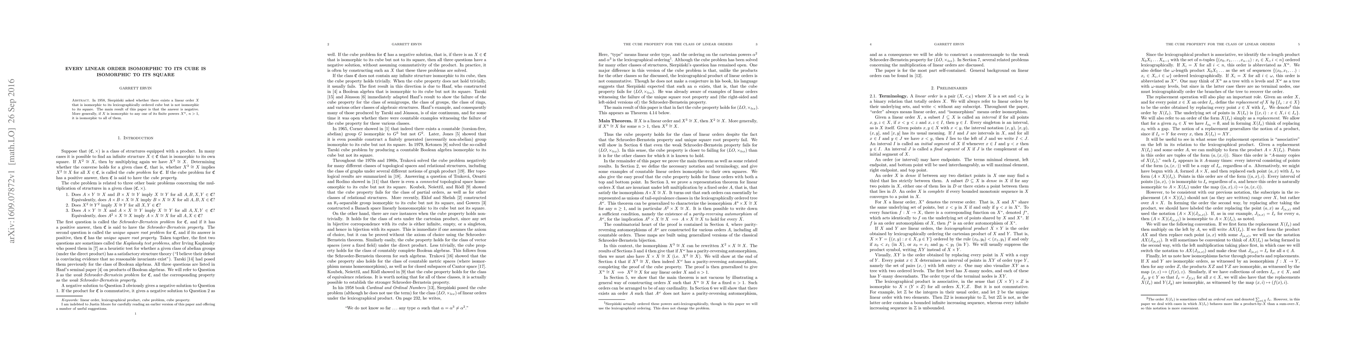 A linear order isomorphic to its cube is also isomorphic to its square, meaning they have a similar structure in both dimensions.