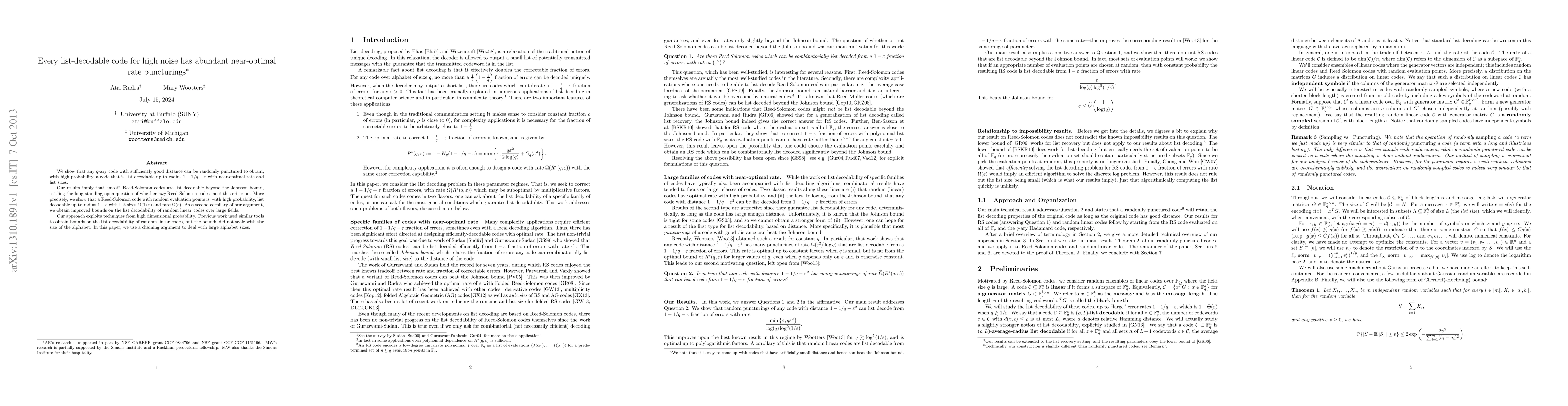 We show that any q-ary code with sufficiently good distance can be randomly punctured to obtain, with high probability, a code that is list decodable up to radius $1 - 1/q - \epsilon$ with near-optimal rate and list sizes. Our results imply that "most" Reed-Solomon codes are list decodable beyond the Johnson bound, settling the long-standing open question of whether any Reed Solomon codes meet this criterion. More precisely, we show that a Reed-Solomon code with random evaluation points is, with high probability, list decodable up to radius $1 - \epsilon$ with list sizes $O(1/\epsilon)$ and rate $\Omega(\epsilon)$. As a second corollary of our argument, we obtain improved bounds on the list decodability of random linear codes over large fields. Our approach exploits techniques from high dimensional probability. Previous work used similar tools to obtain bounds on the list decodability of random linear codes, but the bounds did not scale with the size of the alphabet. In this paper, we use a chaining argument to deal with large alphabet sizes.