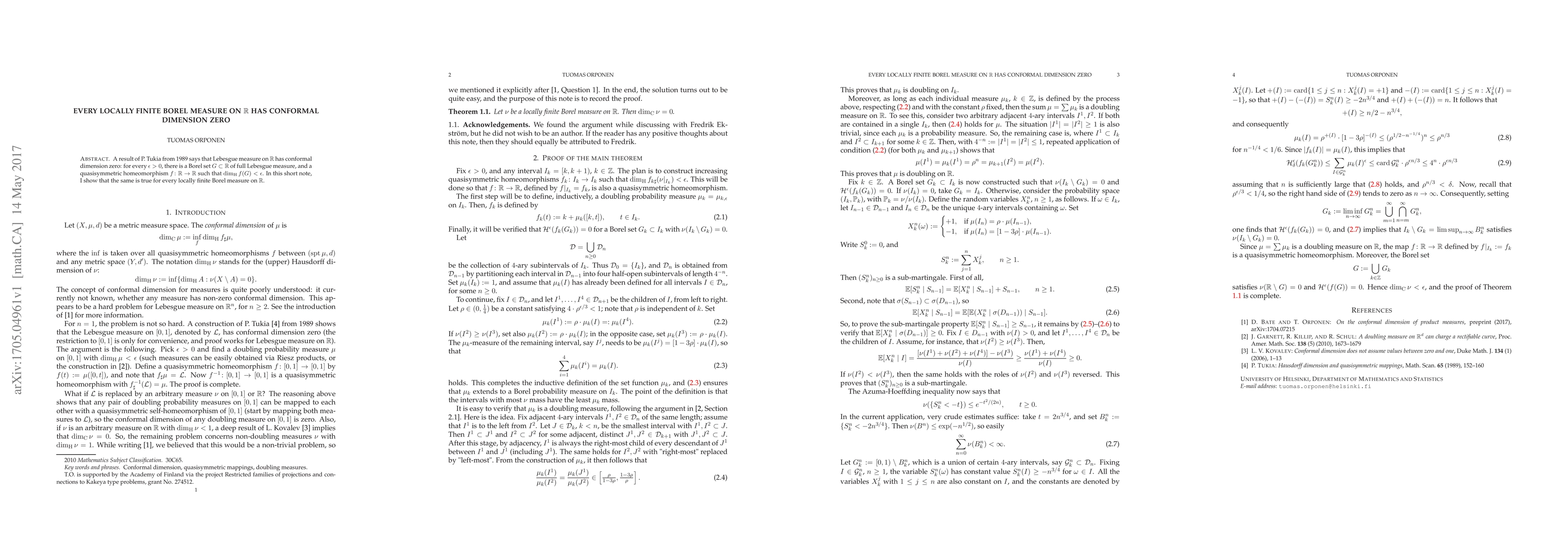 Locally finite Borel measures on $oxed{ ext{R}}$ have conformal dimension zero, implying that for any measure, there exists a set of full measure and a quasisymmetric homeomorphism mapping it to a subset with small Hausdorff dimension.