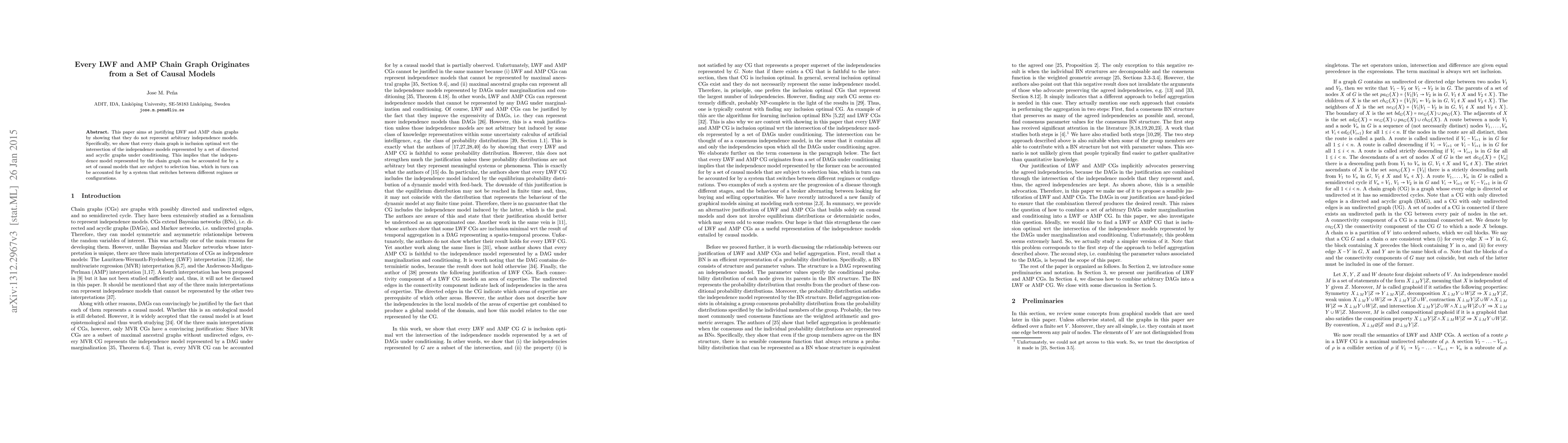 This paper demonstrates that LWF and AMP chain graphs are derived from a set of causal models, proving they are inclusion optimal for the intersection of independence models represented by directed acyclic graphs under conditioning. It concludes that these chain graphs can be explained by a system switching between different regimes or configurations due to selection bias.