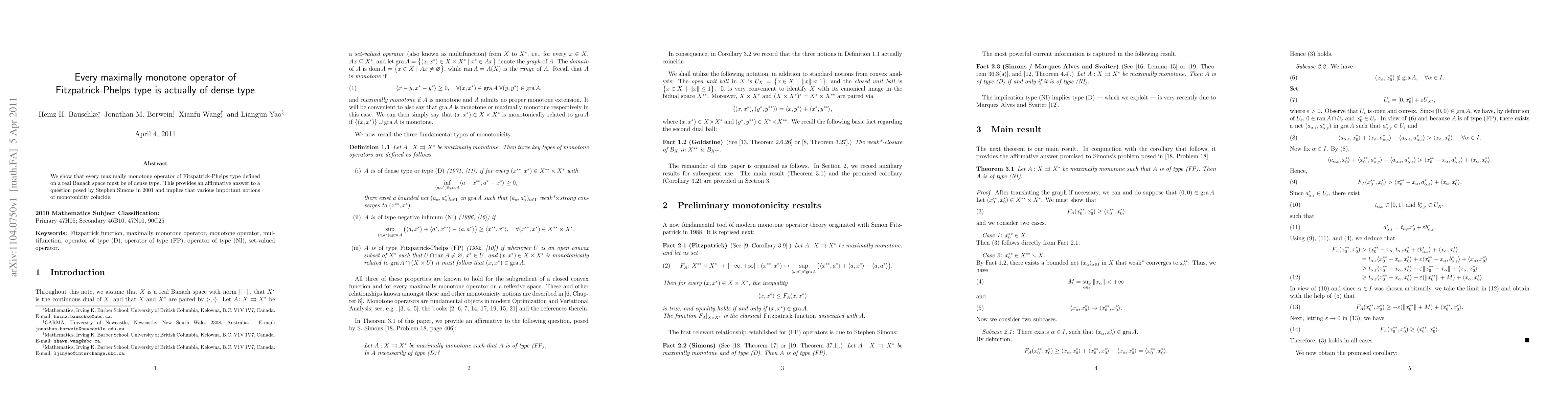 We show that every maximally monotone operator of Fitzpatrick-Phelps type defined on a real Banach space must be of dense type. This provides an affirmative answer to a question posed by Stephen Simons in 2001 and implies that various important notions of monotonicity coincide.