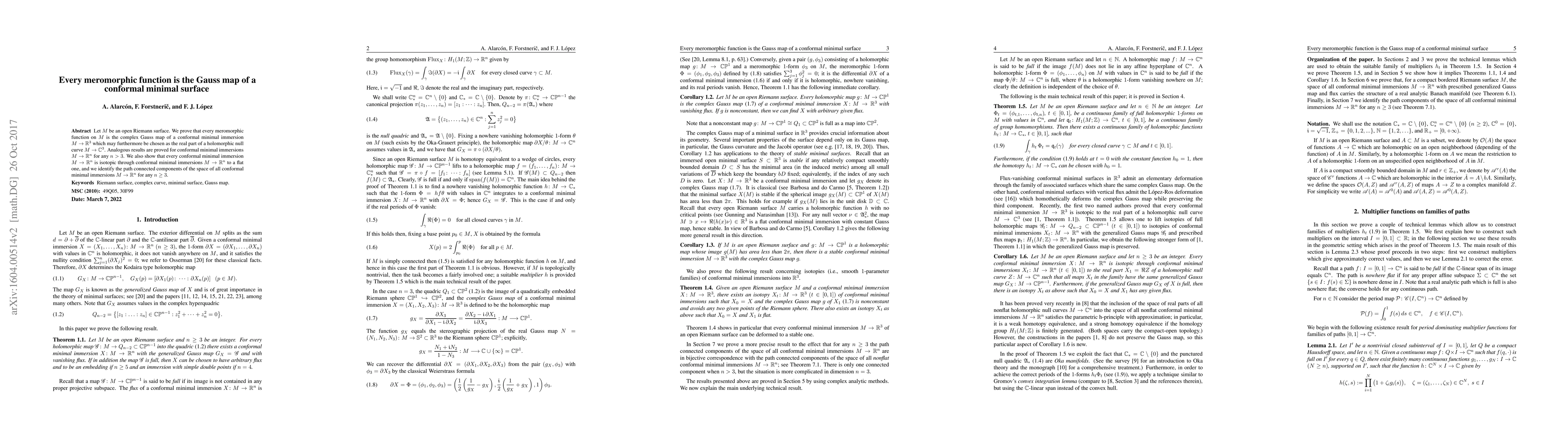 This paper proves that any meromorphic function on an open Riemann surface can be represented as the complex Gauss map of a conformal minimal immersion into $\mathbb{R}^3$, or more generally into $\mathbb{R}^n$ for $n>3$. It also establishes the isotopy of conformal minimal immersions to flat ones and identifies the path-connected components of the immersion space.