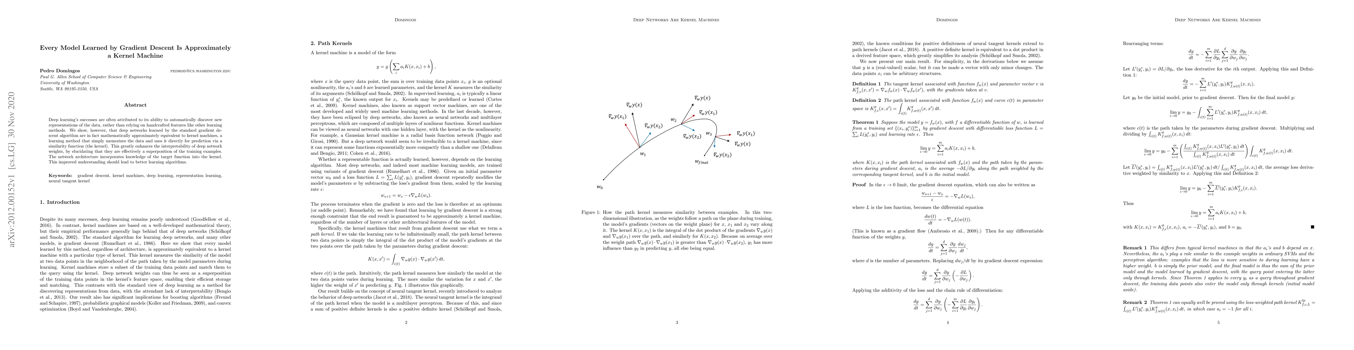 Deep learning's successes are often attributed to its ability to automatically discover new representations of the data, rather than relying on handcrafted features like other learning methods. We show, however, that deep networks learned by the standard gradient descent algorithm are in fact mathematically approximately equivalent to kernel machines, a learning method that simply memorizes the data and uses it directly for prediction via a similarity function (the kernel). This greatly enhances the interpretability of deep network weights, by elucidating that they are effectively a superposition of the training examples. The network architecture incorporates knowledge of the target function into the kernel. This improved understanding should lead to better learning algorithms.